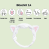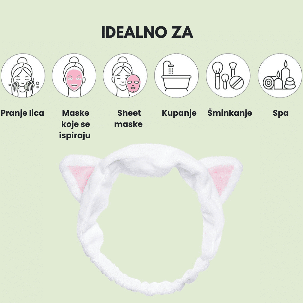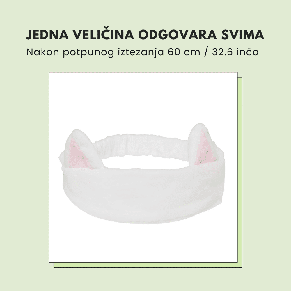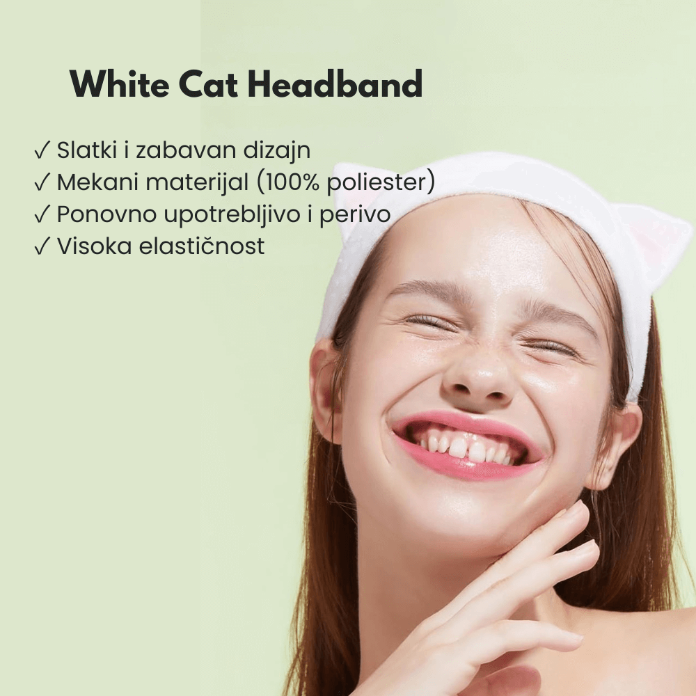 Mekana traka za kosu sa belim mačjim ušima koja drži kosu podalje od lica tokom nege kože ili šminkanja, pružajući udobnost i zabavan izgled.