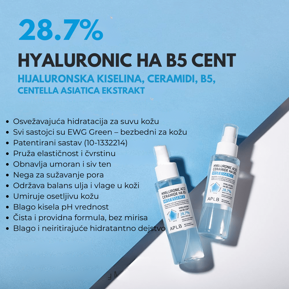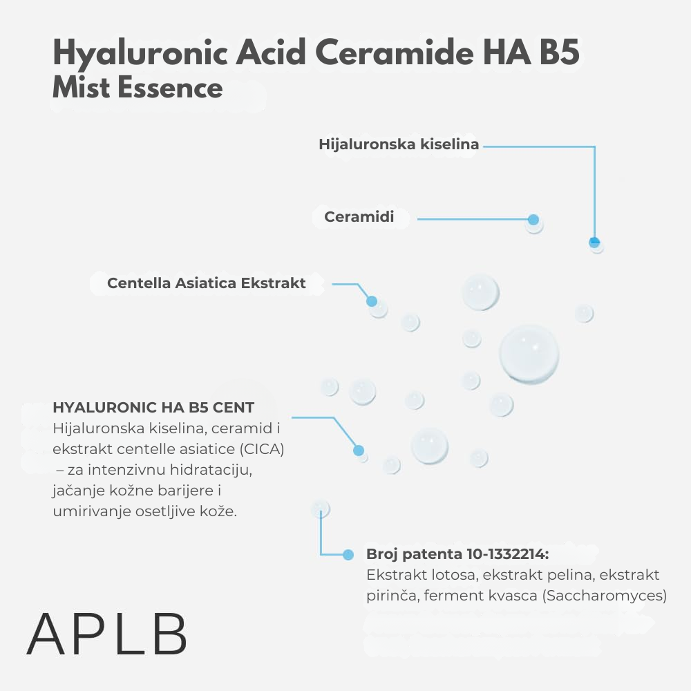 APLB Hyaluronic Acid Ceramide HA B5 Mist Essence je esencija u spreju koja pruža trenutnu hidrataciju i umirujući efekat za sve tipove kože. Formulisana sa 28,7% Hyaluronic HA B5 CEN™ kompleksom, koji kombinuje hijaluronsku kiselinu, ceramide i ekstrakt Centella Asiatica, ova esencija intenzivno hidrira, jača zaštitnu barijeru kože i pomaže u smanjenju crvenila i iritacija. Panthenol (5.000ppm) i natrijum hijaluronat (8.000ppb) dodatno poboljšavaju elastičnost kože i pružaju dugotrajnu vlagu. Njena lagana formula brzo se upija bez ostavljanja lepljivog osećaja, čineći je savršenom za osvežavanje kože tokom dana ili kao dodatni korak u rutini nege. Proizvod je bez mineralnih ulja, parabena, silikona, veštačkih boja i mirisa, što ga čini pogodnim za osetljivu kožu.