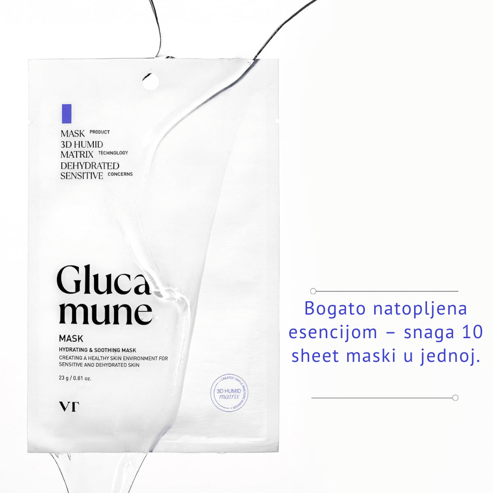 VT Cosmetics predstavlja VT Glucamune Mask sheet masku koja pruža trenutnu hidrataciju i umirenje kože. Formulisana sa Glucamune kompleksom, ova maska nudi 9,7 puta jači umirujući efekat od Heartleaf ekstrakta i 111% više hidratacije od hijaluronske kiseline, što je čini idealnom za osetljivu i dehidriranu kožu. Obogaćena pantenolom i skvalanom, štiti kožnu barijeru i sprečava gubitak vlage, dok alantoin pomaže u smirivanju iritacija.