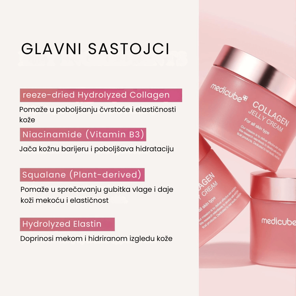 Glavni sastojak, hidrolizovani kolagen, prodire duboko u kožu, pomažući u povećanju čvrstoće i smanjenju finih linija, dok hidrolizovani elastin doprinosi fleksibilnosti kože, čineći je glatkom i otpornom. Niacinamid u formuli pomaže u posvetljavanju tena, smanjenju hiperpigmentacija i jačanju zaštitne barijere kože, dok pantenol i alantoin umiruju i hidratizuju kožu, sprečavajući gubitak vlage.