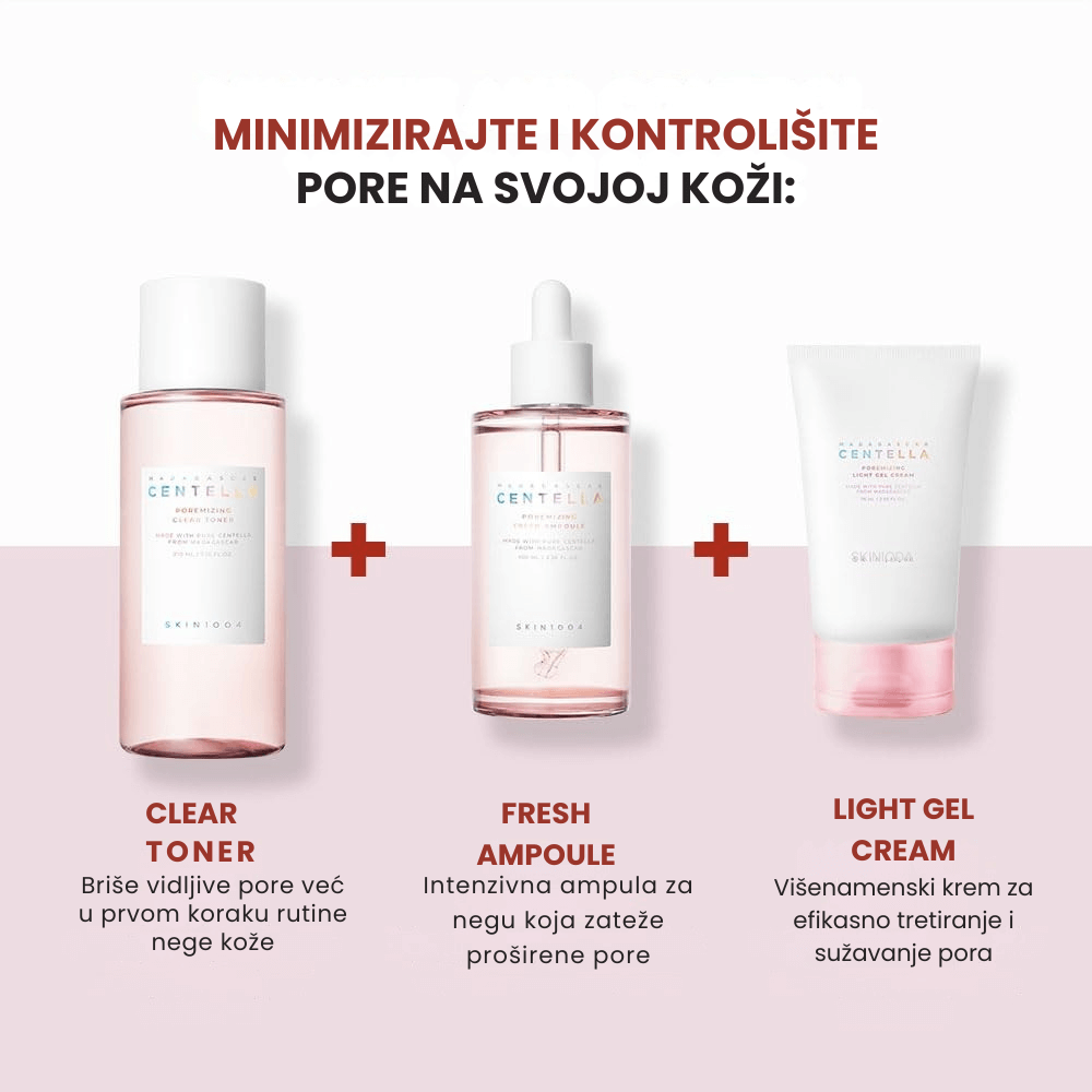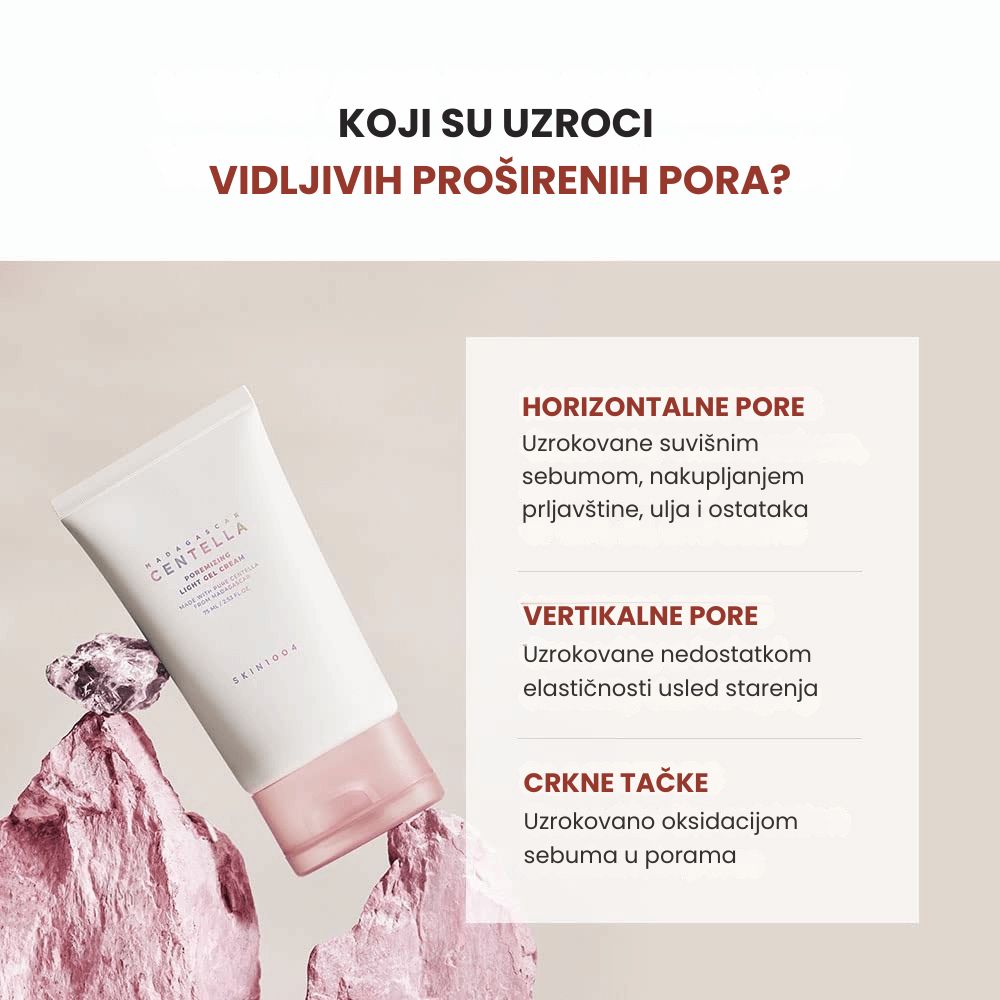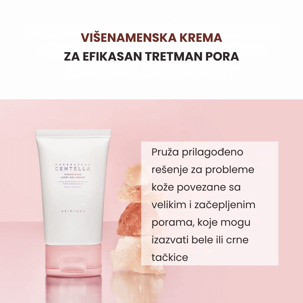 SKIN1004 Madagascar Centella Poremizing Light Gel Cream je lagana krema sa gel teksturom koja pruža trenutni osećaj hlađenja i dubinsku hidrataciju, ostavljajući kožu glatkom i sjajnom. Obogaćena je ekstraktom Centella Asiatica, poznatom po svojim umirujućim svojstvima, i himalajskom ružičastom solju koja pomaže u uklanjanju nečistoća iz pora, sprečavajući njihovo proširenje. Dodatni sastojci poput ekstrakta čempresa i hamamelisa smiruju i balansiraju osetljivu kožu, dok niacinamid posvetljuje ten i poboljšava elastičnost kože.