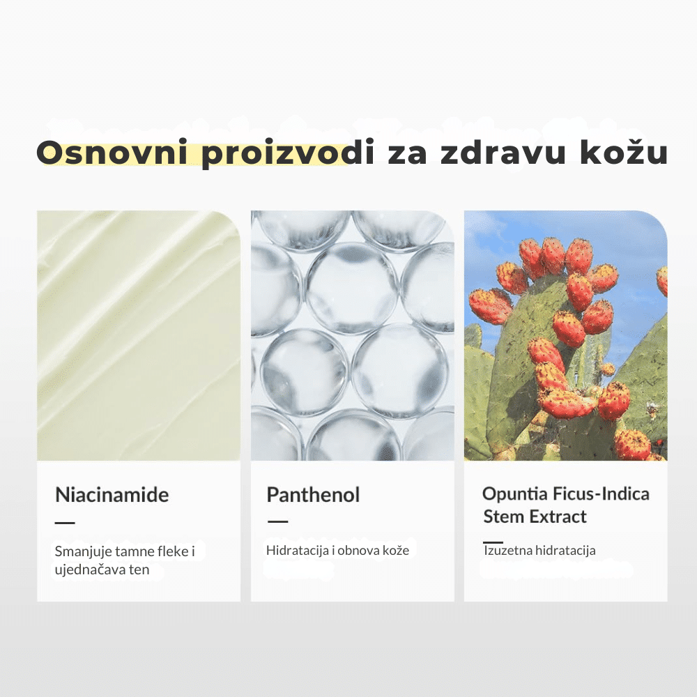 Opuntia Ficus-Indica Stem Extract – Ekstrakt stabljike kaktusa smokve je pravi hidratacioni boost za kožu! Bogat je antioksidansima, polisaharidima i esencijalnim mineralima, koji pomažu u smirivanju iritacija, jačanju kožne barijere i zaštiti od spoljašnjih uticaja. Ima snažna hidratantna i regenerativna svojstva, pomaže u zadržavanju vlage i ostavlja kožu glatkom, nahranjenom i blistavom.
