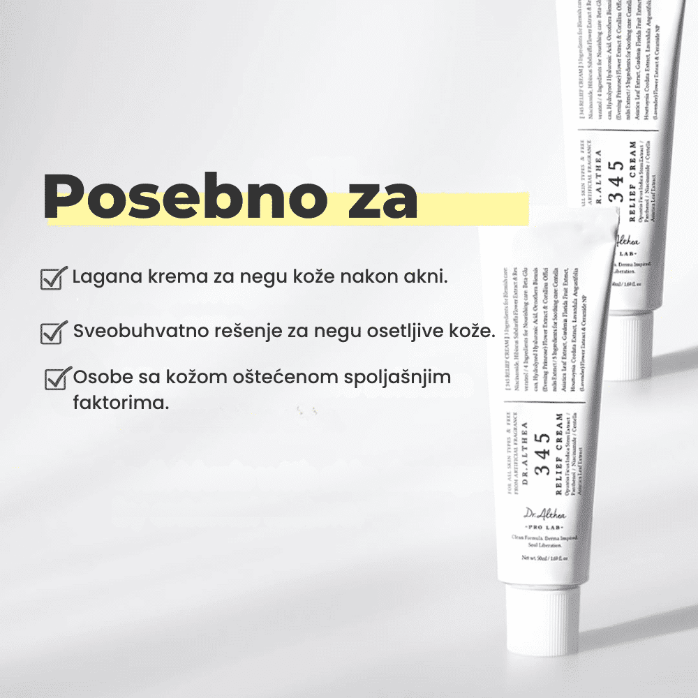 Dr. Althea 345 Relief Cream: veganska gel-krema sa niacinamidom, pantenolom i hijaluronskom kiselinom za hidrataciju, umirenje i regeneraciju kože.