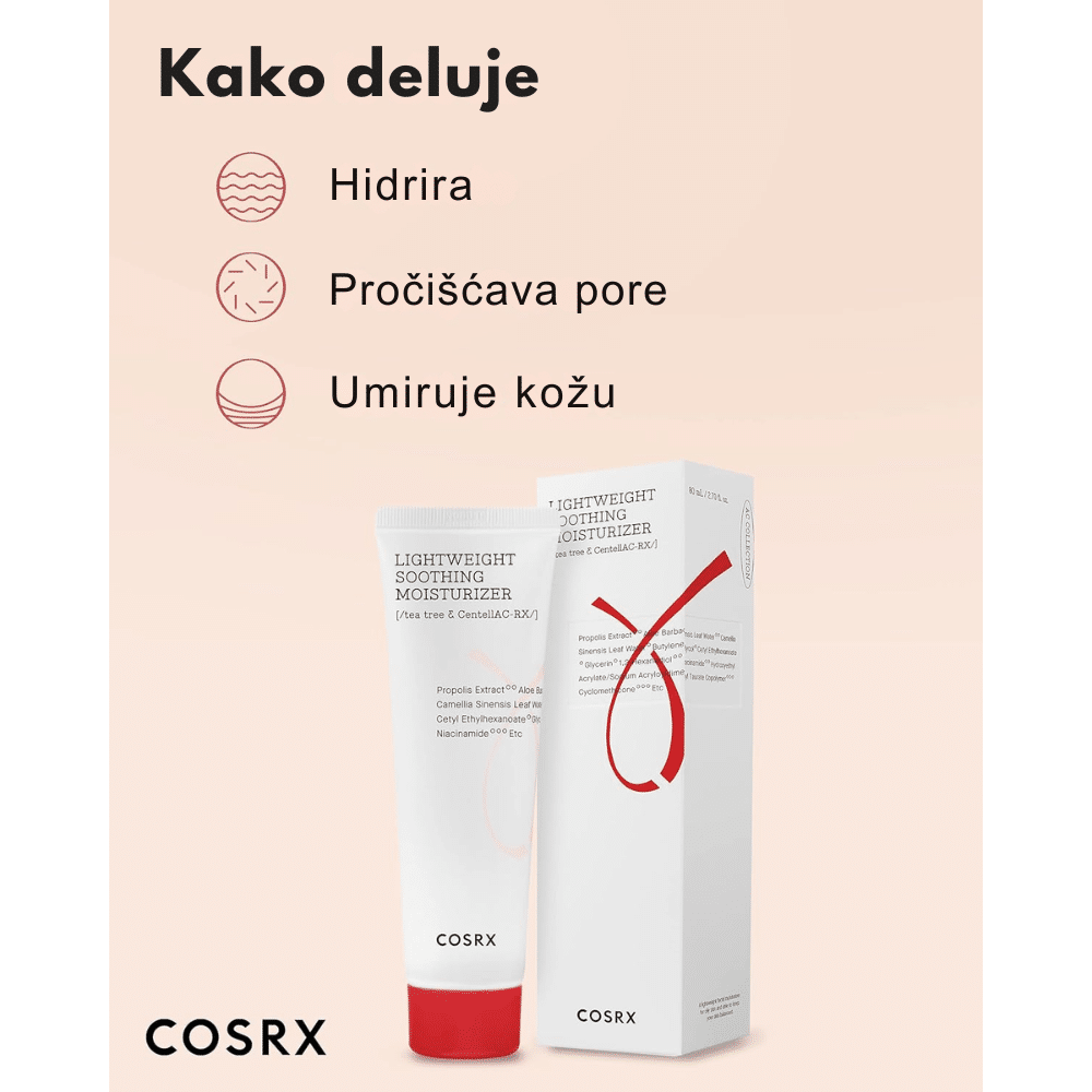 COSRX AC Collection Lightweight Soothing Moisturizer 80ml je lagana hidratantna krema koja je posebno formulsana za kožu sklonu aknama i iritacijama. Sadrži posebnu formulu CentellAC-Rx kompleks koji ne samo da tretira akne, već i pomaže u revitalizaciji i oporavku kože bez iritacija zahvaljujući COSRX Centella AC-Rx kompleksu.