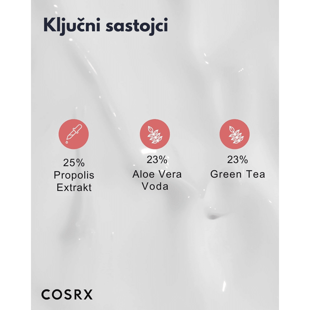 Cosrx je korejski kozmetički brend poznat po svojoj efikasnosti i jednostavnim, ali visokokvalitetnim proizvodima za negu kože. Osnovan 2013. godine, Cosrx je postao popularan zahvaljujući svojoj posvećenosti stvaranju proizvoda koji koriste minimalan broj sastojaka, ali sa maksimalnim učinkom, što ih čini idealnim za osetljivu kožu. Brend nudi širok spektar proizvoda, uključujući serume, tonere, maske i kreme, sa naglaskom na upotrebi sastojaka kao što su AHA, BHA, niacinamid, propolis i drugi biljni ekstrakti. Njihovi proizvodi su veganski, cruelty-free i ne sadrže parabene, sulfate ili veštačke mirise. Cosrx je prepoznat po svojoj jednostavnoj, ali efikasnoj formuli koja pomaže u rešavanju problema sa kožom kao što su akne, suvoća i nepravilnosti. Takođe, brend se ističe svojom posvećenostšću naučnoj i dermatološkoj istraživačkoj osnovi.