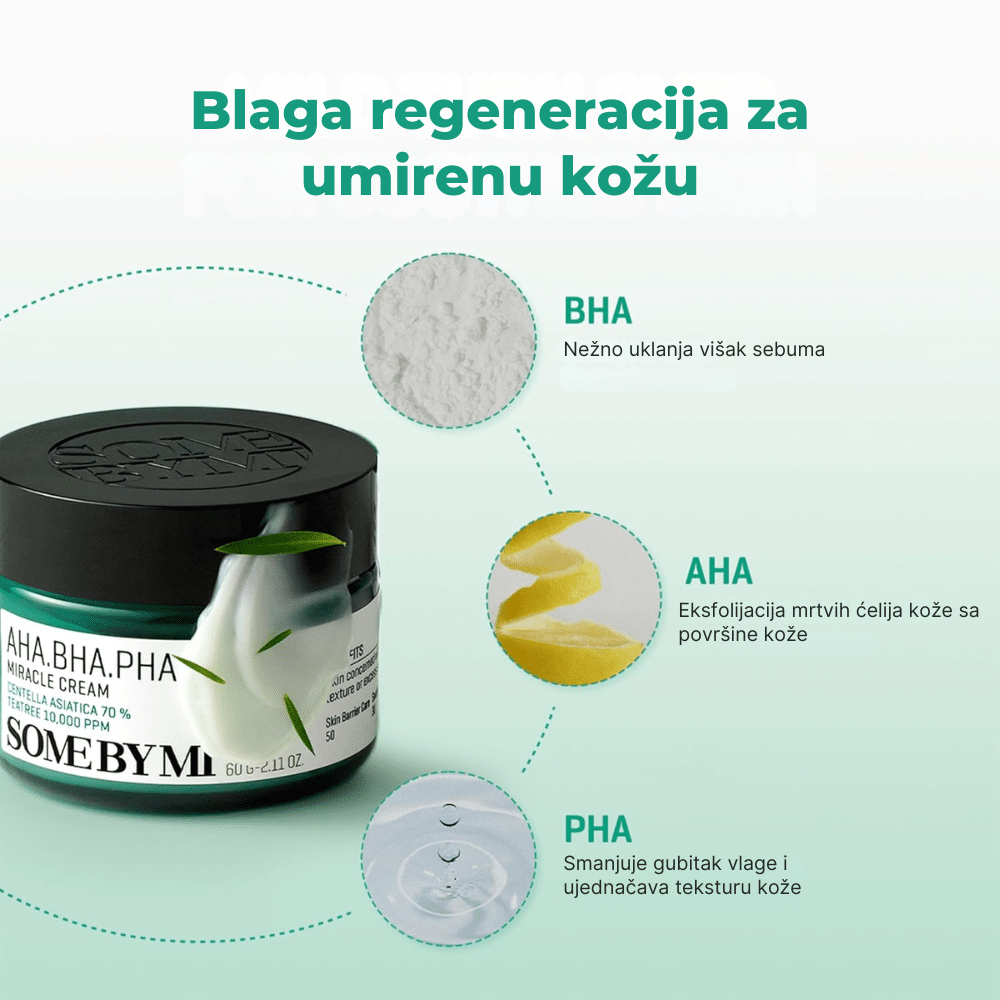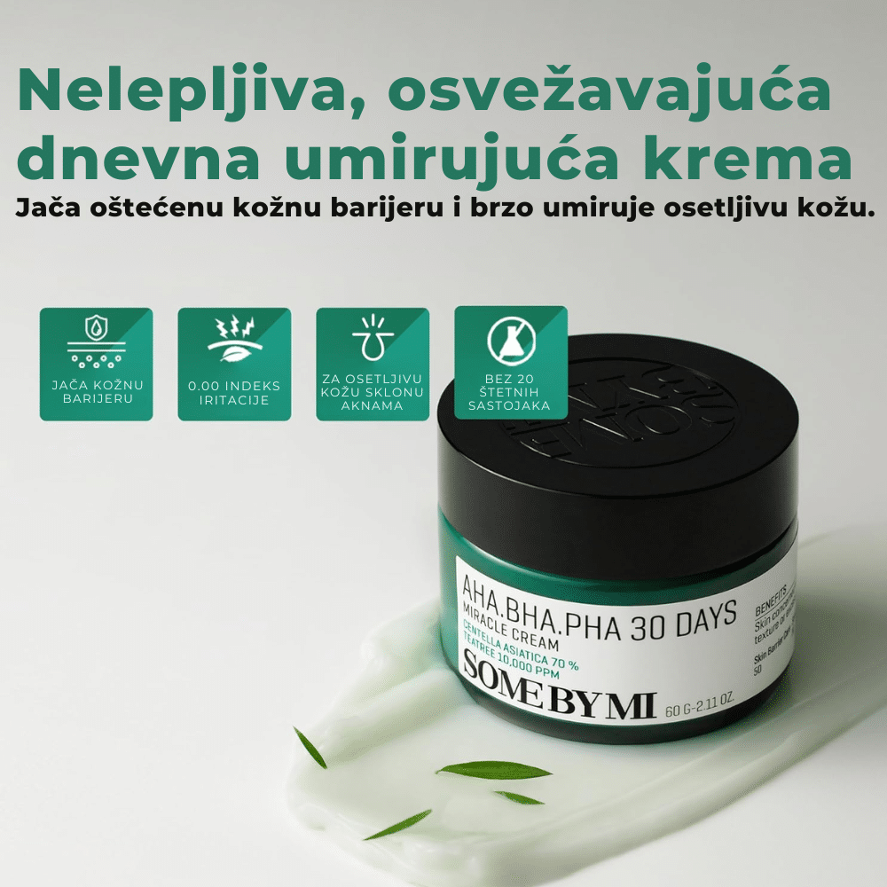 SOMEBYMI AHA.BHA.PHA 30 Days Miracle Cream 60ml je intenzivna hidratantna krema formulisana za dubinsku negu i regeneraciju problematične kože. Obogaćena AHA, BHA i PHA kiselinama, krema pruža blagu eksfolijaciju, čisti pore i uklanja mrtve ćelije kože, dok umanjuje pojavu akni i sprečava njihovo nastajanje. Ekstrakt čajevca i centelle asiatice smiruje iritacije i crvenilo, dok dodatni sastojci poput niacinamida i hijaluronske kiseline ujednačavaju ten i pružaju dubinsku hidrataciju. Njena lagana, nemasna formula savršena je za svakodnevnu upotrebu, ostavljajući kožu glatkom, osveženom i zdravom.