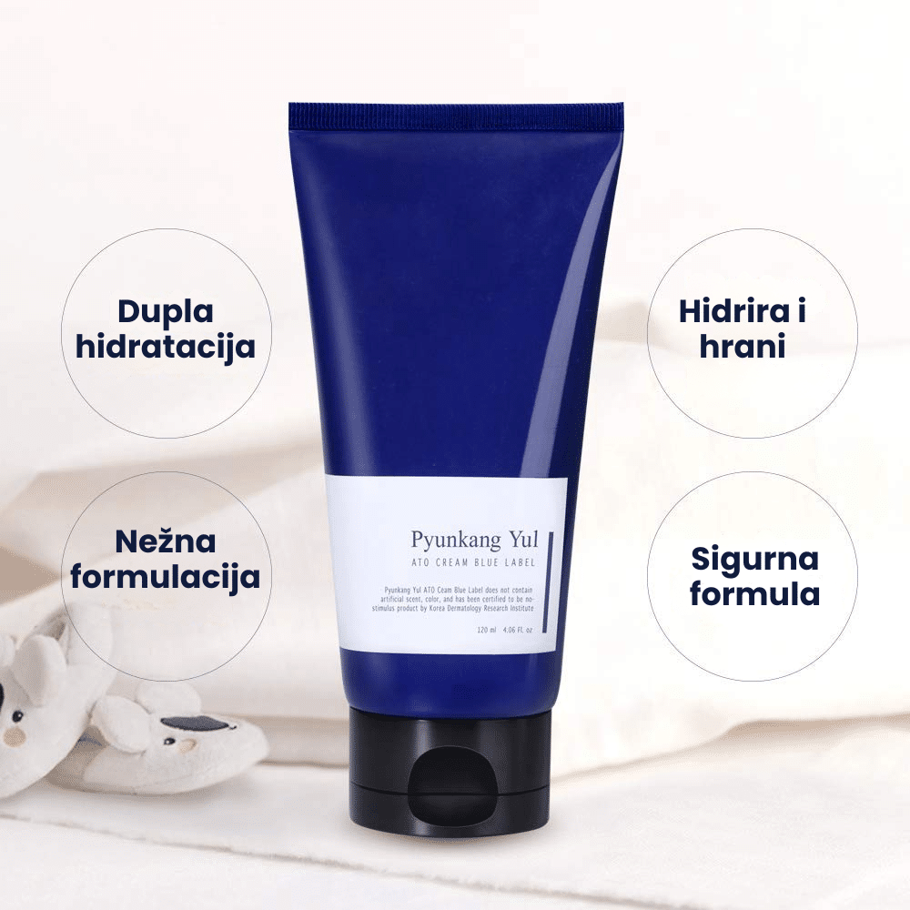 Pyunkang Yul ATO Cream Blue Label je specijalno formulisana krema namenjena dubinskoj hidrataciji i umirenju iritacija. Idealan izbor za suvu, osetljivu kožu, uključujući i dečiju kožu, zahvaljujući bogatoj formuli sa ceramidima, peptidima i prirodnim biljnim ekstraktima.Ceramidi i shea puter obezbeđuju intenzivnu vlagu i čine kožu glatkom i nahranjenom.Ekstrakt orlovog nokta (Lonicera Japonica) deluje protivupalno i smanjuje crvenilo i svrab.Peptidi i prirodna ulja pomažu u obnovi oštećene kože, zadržavajući vlagu.Bez veštačkih mirisa i boja, idealna je za svakodnevnu upotrebu na licu i telu, čak i za bebe i decu.Ova krema je vaš saveznik u borbi protiv suvoće i iritacija, pružajući koži zdrav i hidriran izgled tokom cele godine. Dodajte je svojoj rutini nege i uživajte u mekoj, umirenoj i zaštićenoj koži.