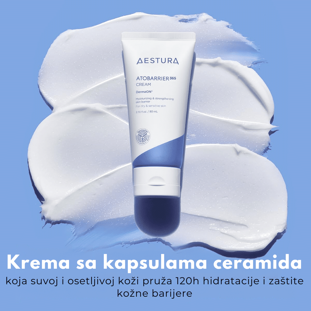 Posebnost ove kreme je i u tome što sadrži kapsulisane ceramide koji pružaju do 120 sati hidratacije, pomažući u obnavljanju oštećene kožne barijere. Uz dodatak pantenola, koji umiruje iritacije, i madeskasozida iz Centella Asiatica biljke, koji regeneriše kožu, ova krema pomaže u smanjenju crvenila i poboljšava otpornost kože na spoljne iritanse. AESTURA Atobarrier 365 Cream se izdvaja svojom DermaON™ tehnologijom, koja efikasno imitira prirodnu barijeru kože, pružajući dugotrajnu zaštitu i hidrataciju. Bogata, ali lagana tekstura idealna je za svakodnevnu upotrebu, dok umirujući sastojci pomažu u oporavku oštećene i osetljive kože. Savršen izbor za one sa suvom i atopičnom kožom koja traži intenzivnu negu i dugotrajnu zaštitu.