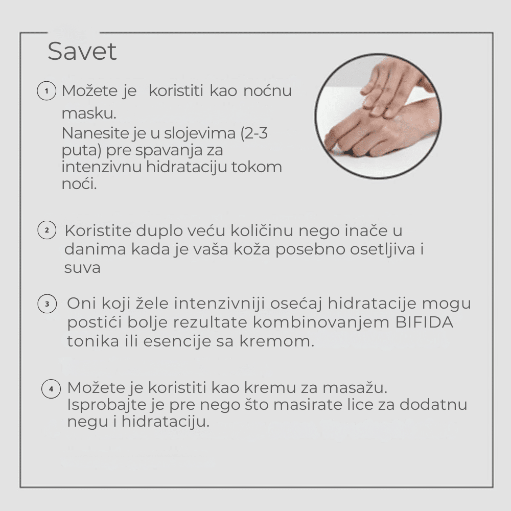 Nanesite odgovarajuću količinu Mixsoon Bifida Cream na očišćeno lice i vrat, kao poslednji korak u rutini nege. Lagano umasirajte dok se krema potpuno ne upije. Koristite ujutru i uveče.