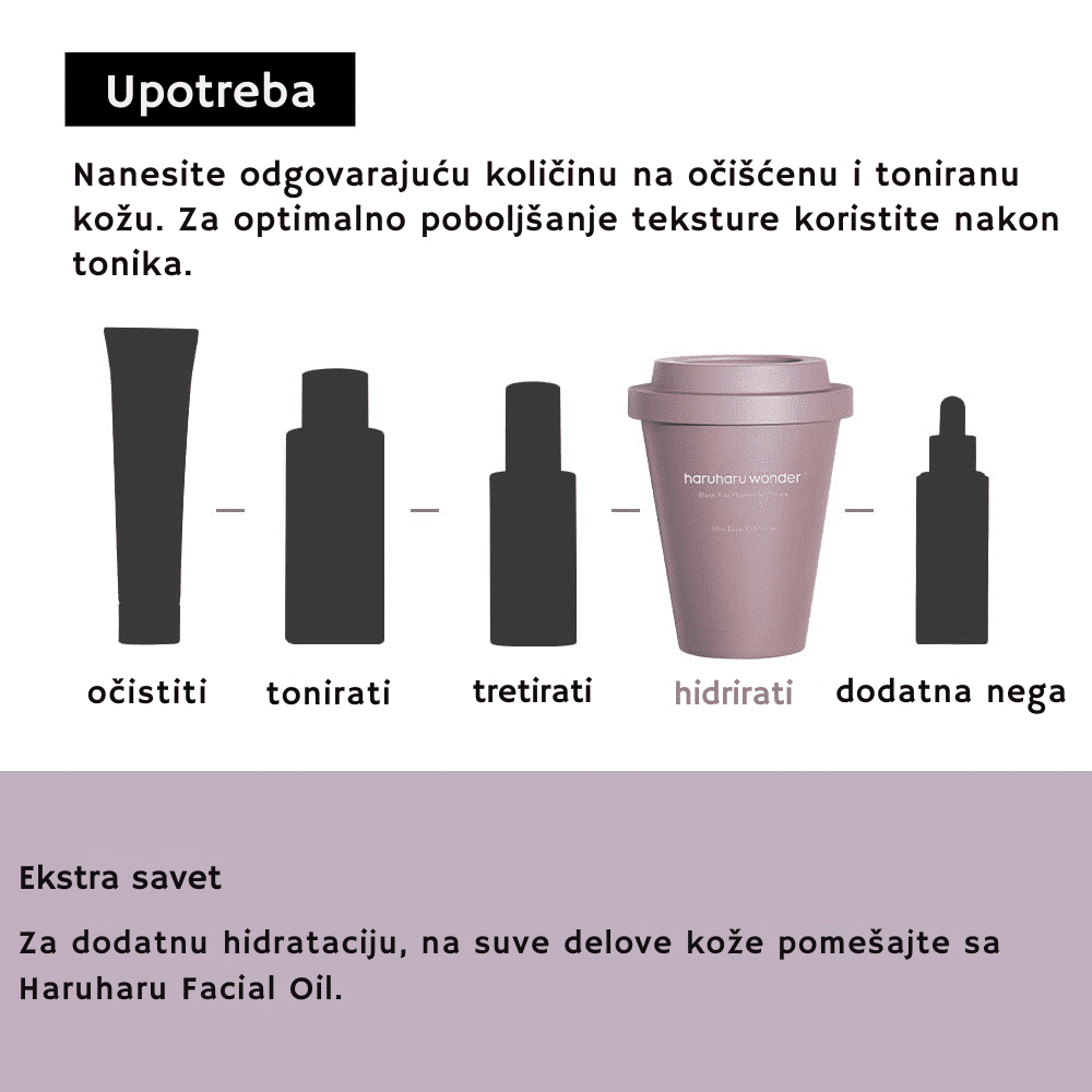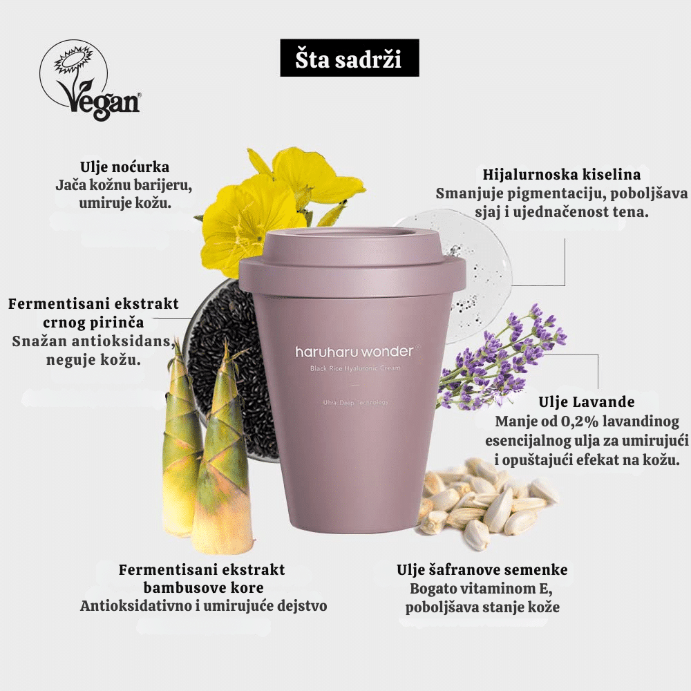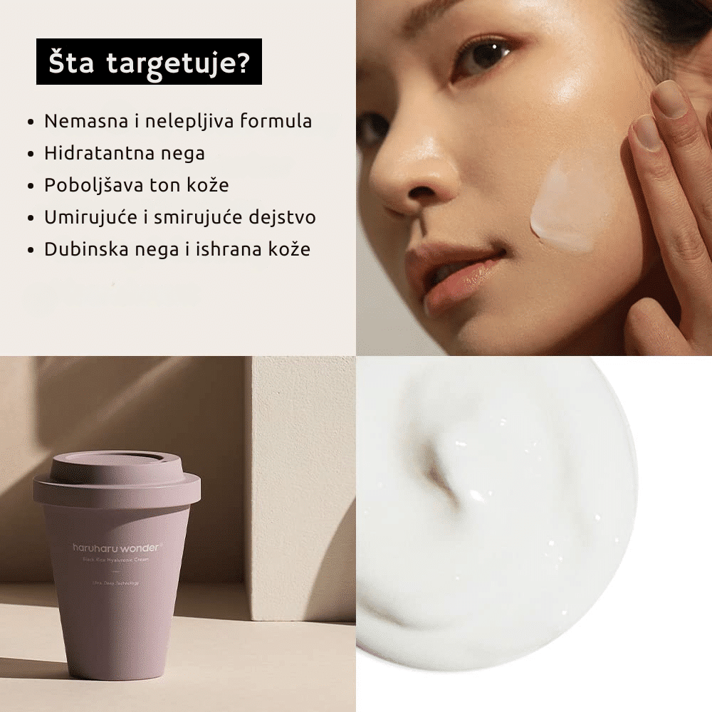 Hidratantna krema sa crnim pirinčem i hijaluronskom kiselinom koja pruža intenzivnu hidrataciju, poboljšava elastičnost i smanjuje znakove starenja.