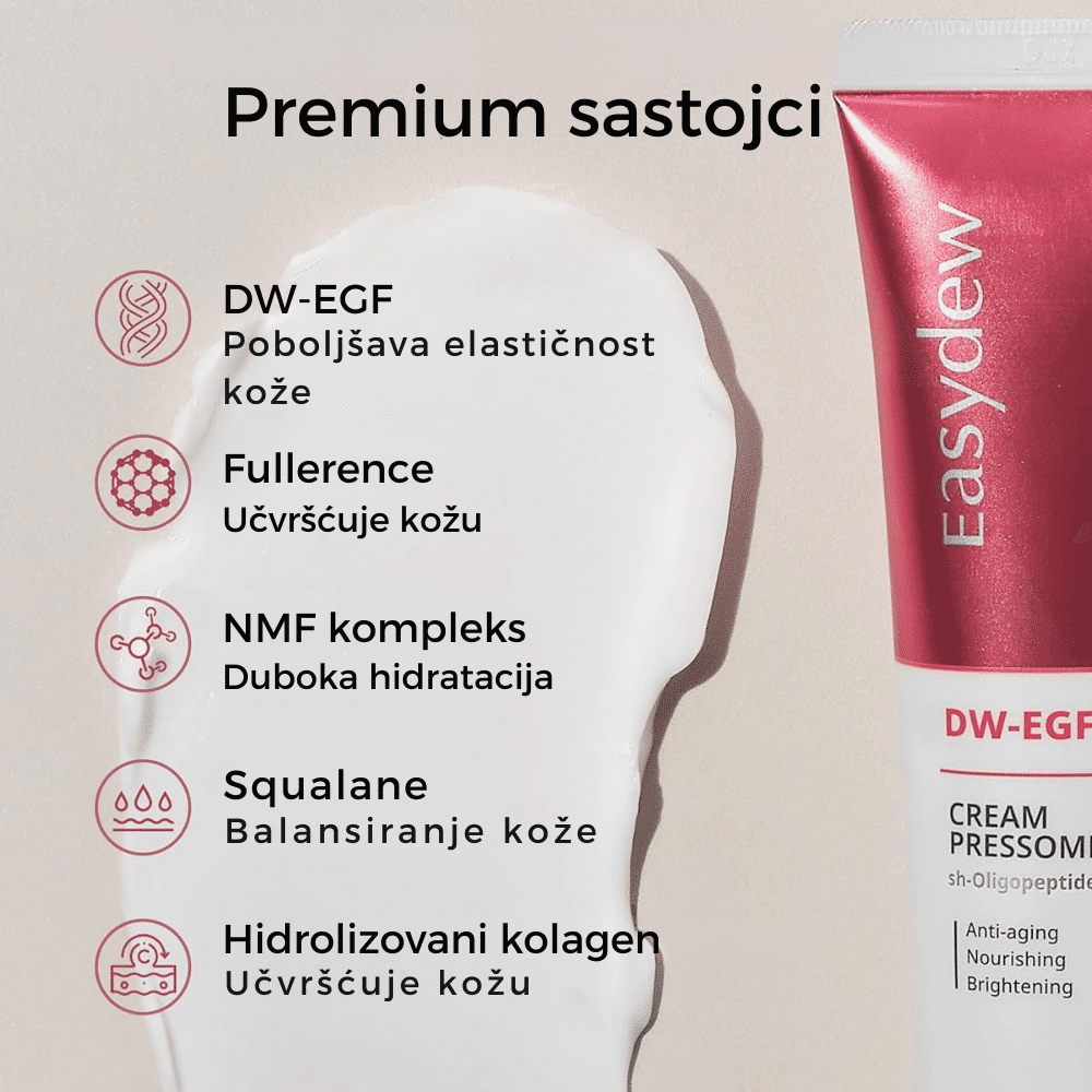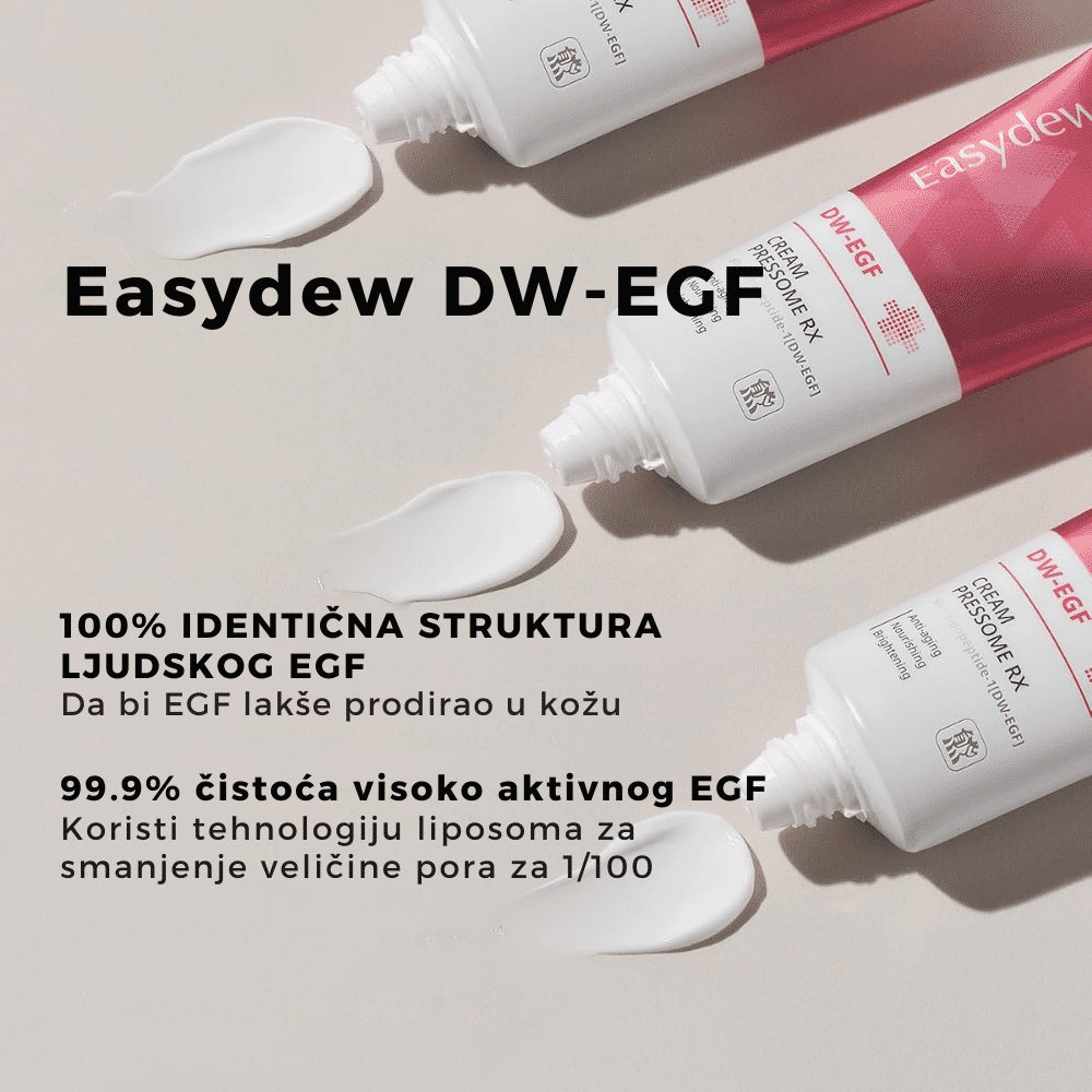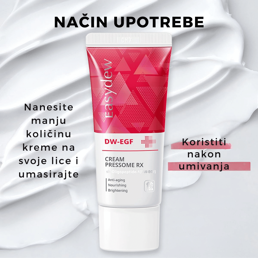 EASYDEW DW-EGF Cream Pressome RX regeneriše kožu, smanjuje bore i pruža dubinsku hidrataciju uz DW-EGF i hijaluronsku kiselinu.