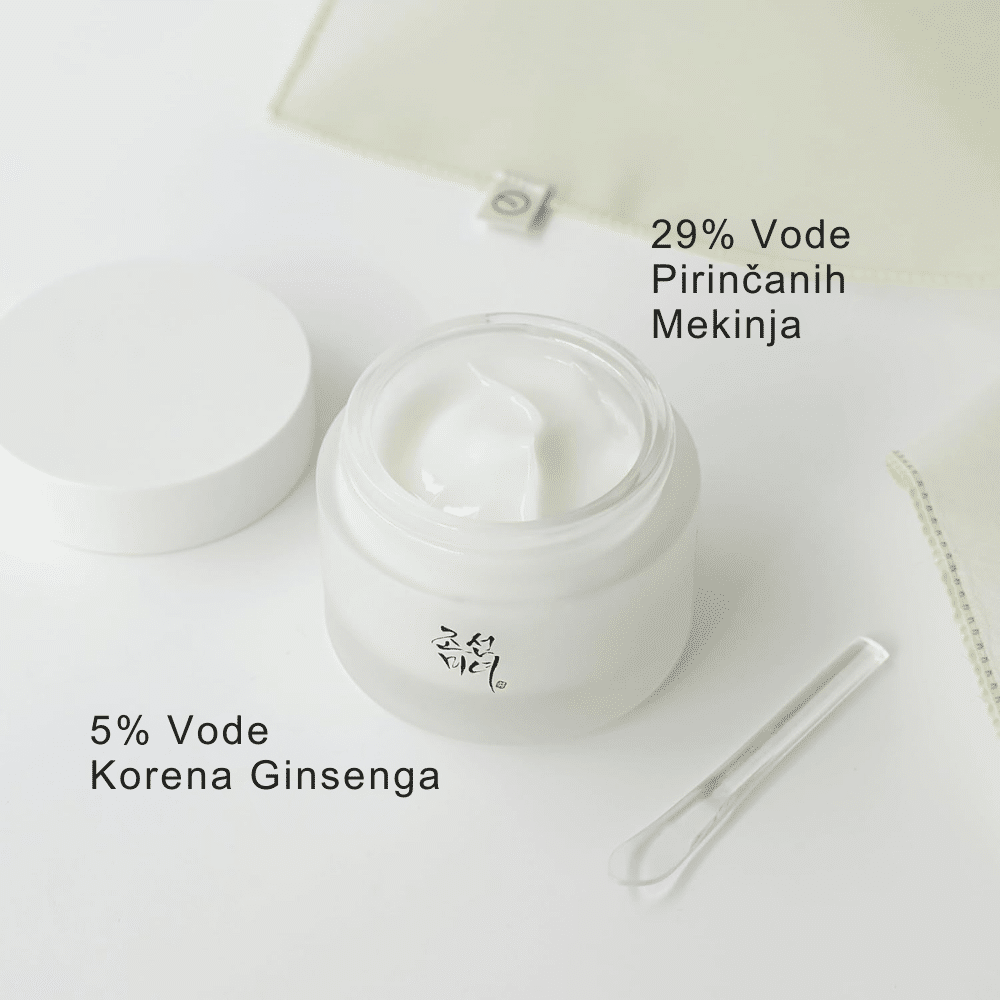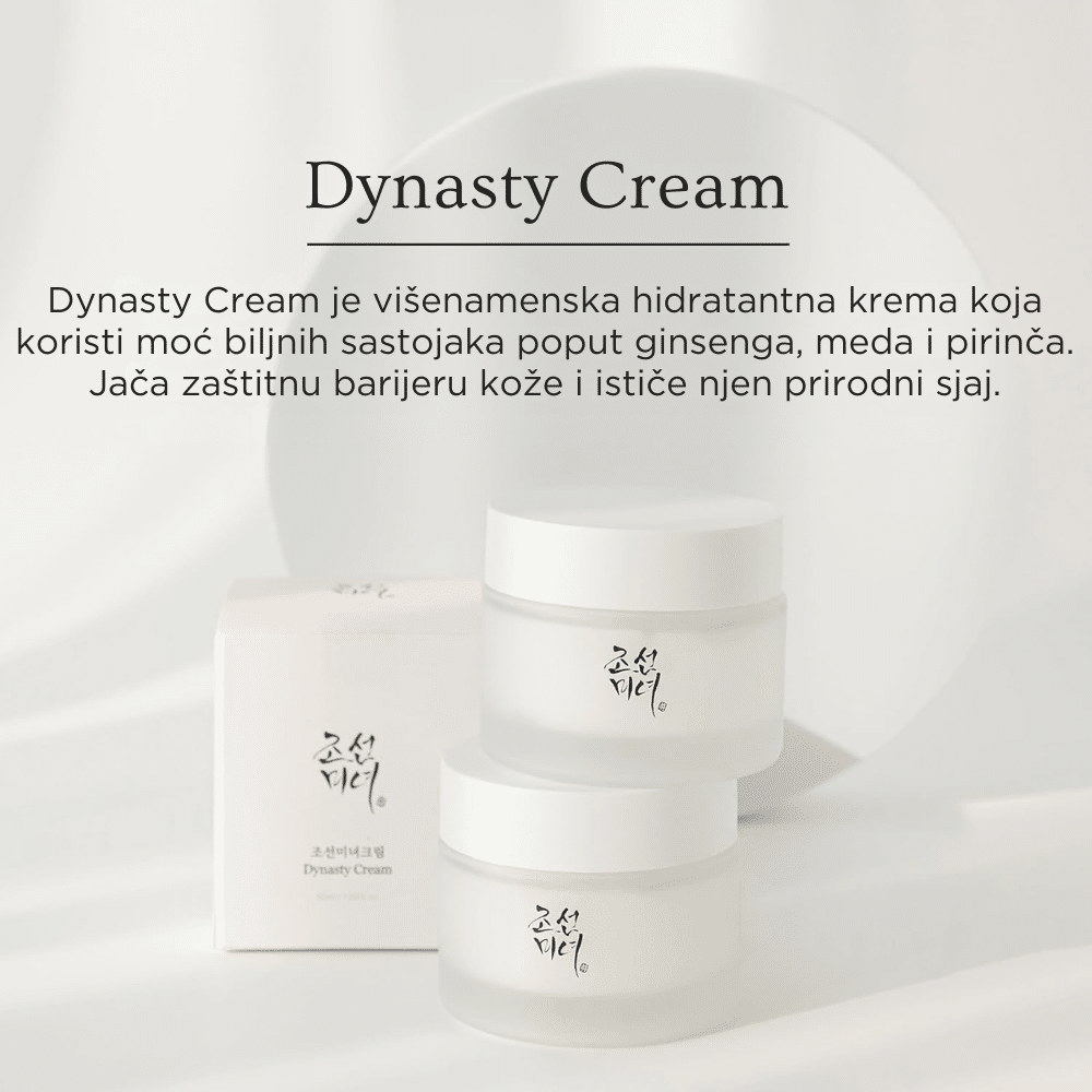 Beauty of Joseon Dynasty Cream 50ml je luksuzna krema inspirisana korejskom tradicijom, koja kombinuje Ginseng i Pirinčane klice kako bi koži pružila dubinsku hidrataciju, regeneraciju i zaštitu. Ginseng poboljšava cirkulaciju i tonus kože, smanjuje fine linije i bore, stimuliše proizvodnju kolage što rezultira mladalačkim sjajem. Pirinčane klice kao još jedan glavni sastojak su bogate aminokiselinama, mineralima i vitaminom E, pomaže u čišćenju kože, posvetljavanju i izjednačavanju tena. Formula je dodatno obogaćena niacinamidom i skvalanom, te obezbedjuje potrebnu hidrataciju i revitalizaciju, smanjujući znakove starenja i vraćajući joj prirodnu elastičnost. Krema se brzo upija, ne ostavljajući masni trag, i ostavlja kožu glatkom, hidratizovanom i svežom. Idealna je za zrelu kožu, kožu sklonu suvoći i one koji žele da poboljšaju teksturu i tonus kože. Formulacija je bez parabena, veštačkih boja i mirisa.