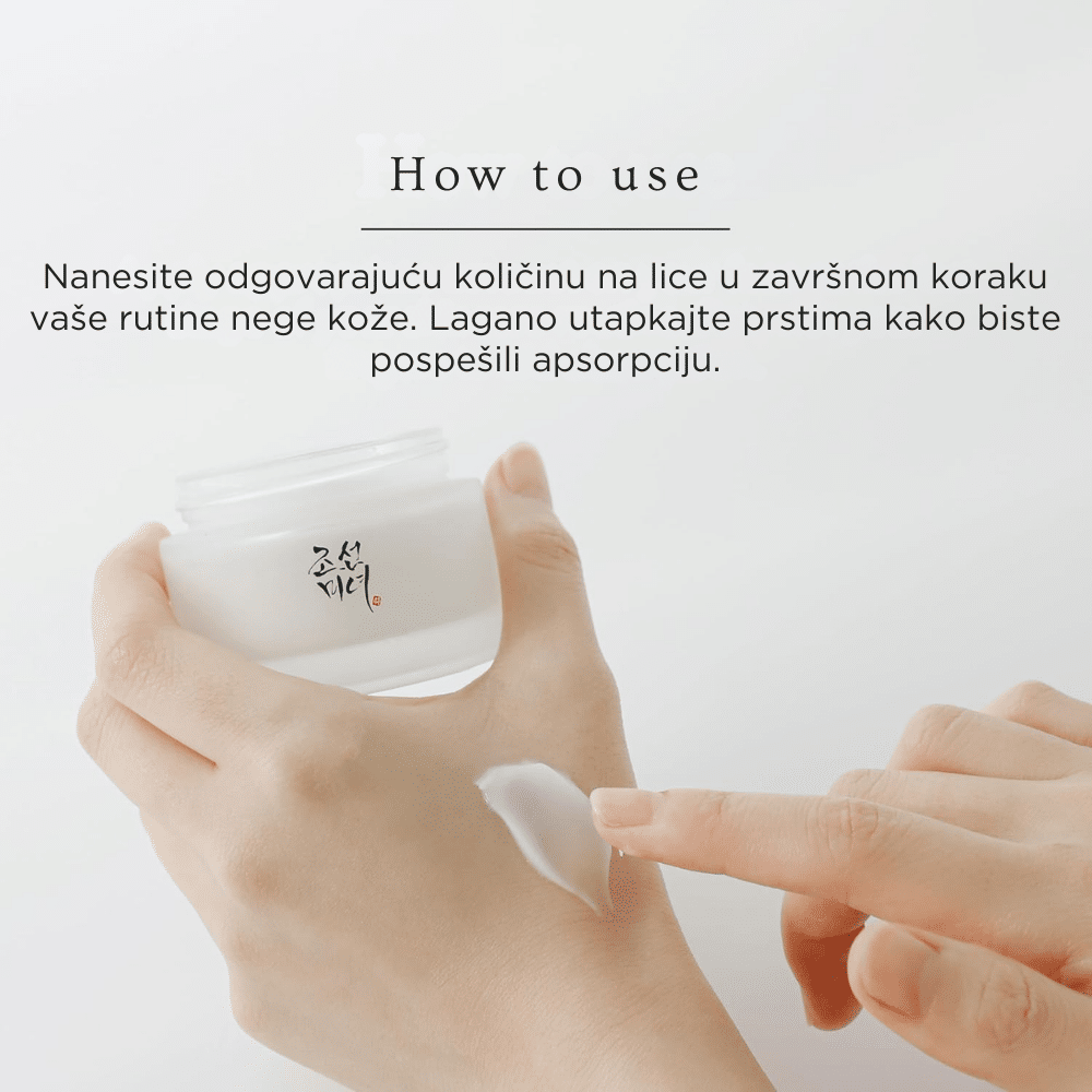 Nanesite odgovarajuću količinu Beauty of Joseon [Renew] Dynasty Cream na očišćeno i tonirano lice. Lagano umasirajte kremu u kožu, fokusirajući se na područja sa suvoćom ili borama. Koristite ujutro i uveče kao poslednji korak u rutini nege kože.