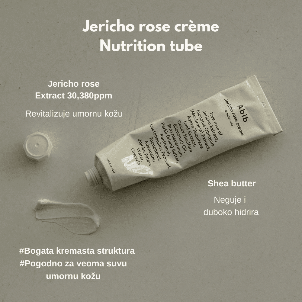 Abib Jericho Rose Crème Nutrition Tube je bogata hranljiva krema dizajnirana za dubinsku negu suve i dehidrirane kože.