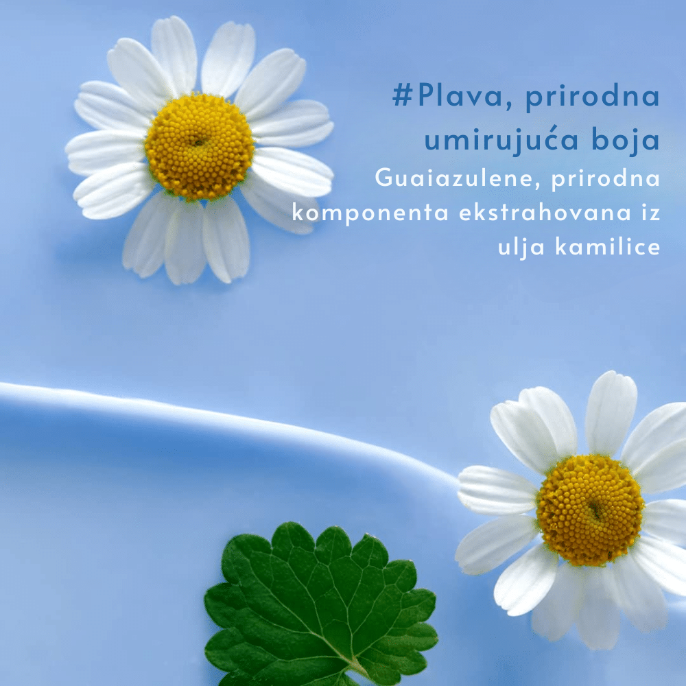 Gvajazulen je aktivni sastojak koji se prirodno dobija iz ulja kamilice i karakterističan je po svojoj intenzivnoj plavoj boji. Ima snažno umirujuće i protivupalno dejstvo, pa pomaže u smirivanju iritacija, crvenila i osetljivosti kože. Takođe doprinosi obnovi i jačanju zaštitne barijere kože, zahvaljujući čemu koža postaje otpornija na spoljašnje uticaje