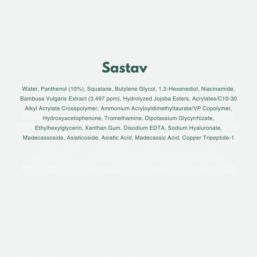 Water, Panthenol, Squalane, Butylene Glycol, 1,2-Hexanediol, Niacinamide, Bambusa Vulgaris Extract, Hydrolyzed Jojoba Esters, Acrylates/C10-30 Alkyl Acrylate Crosspolymer, Ammonium Acryloyldimethyltaurate/VP Copolymer, Hydroxyacetophenone, Tromethamine, Dipotassium Glycyrrhizate, Ethylhexylglycerin, Xanthan Gum, Disodium EDTA, Sodium Hyaluronate, Madecassoside, Asiaticoside, Asiatic Acid, Madecassic Acid, Copper Tripeptide-1