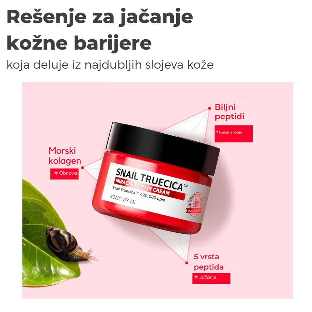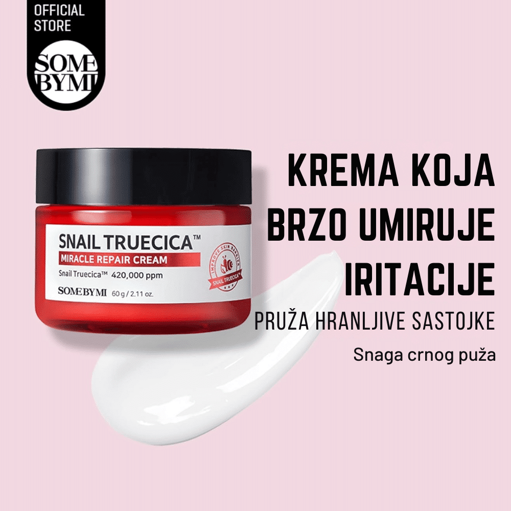 SOMEBYMI Snail Truecica Miracle Repair Cream 60g je regenerativna krema obogaćena Snail Truecica™ kompleksom koji kombinuje ekstrakt puževe sluzi (40%) i Truecica™ za intenzivnu obnovu kože, smanjenje ožiljaka i umirivanje iritacija. Ova moćna formula pomaže u jačanju kožne barijere, ujednačavanju tena i obnavljanju oštećene kože. Uz dodatak niacinamida i adenozina, krema pruža anti-aging efekte, posvetljuje kožu i smanjuje pojavu finih linija. Njena lagana tekstura brzo se upija i ne ostavlja masni trag, čineći je pogodnom za sve tipove kože, uključujući osetljivu i problematičnu.