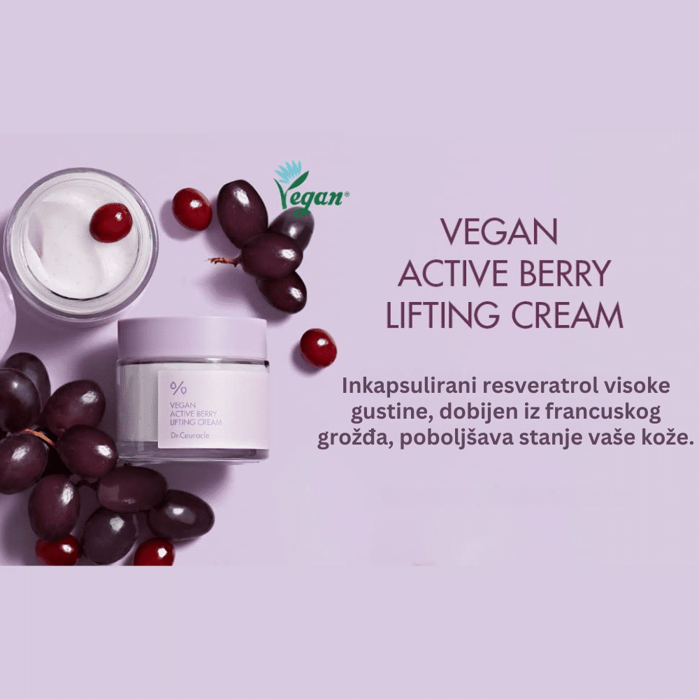 Dr.Ceuracle Vegan Active Berry Lifting Cream 75g je lifting krema koja koristi naprednu tehnologiju kapsuliranja aktivnih sastojaka zarad njijove zaštite i efikasne isporuke. Sadrži visoku koncentraciju aktivnih sastojaka, 20.000 ppm Active Berry Complex, koji uključuje ekstrakt grožđa i resveratrol za duboku hidrataciju i poboljšanje vitalnosti kože. . Vegan Active Berry Lifting Cream sadrži hijaluronsku kiselinu koja pruža dubinsku hidrataciju, obnavlja kožnu barijeru i povećava elastičnost kože. Ova kremasta formula se brzo upija, ne ostavljajući masni trag, a koža postaje glatka, zategnuta i osvežena. Idealna je za zrelu kožu, kožu sa opuštenim područjima ili finim linijama, jer poboljšava tonus i daje koži čvršći izgled. Dr.Ceuracle Vegan Active Berry Lifting Cream je odličan izbor za dnevnu i noćnu upotrebu.