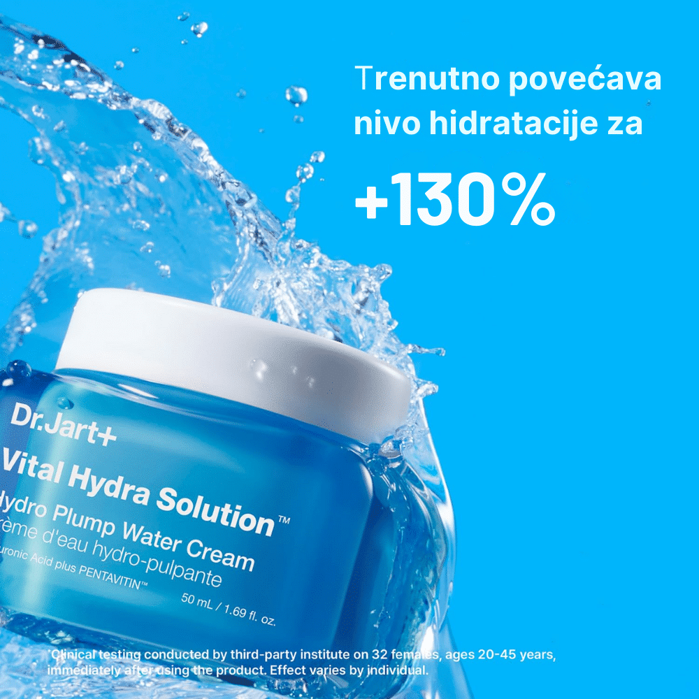 Dr.Jart+ Vital Hydra Solution Hydro Plump Water Cream 50ml je lagana hidratantna krema koja koristi hijaluronsku kiselinu i beta-glukan kako bi pružila koži intenzivnu hidrataciju i povećala njen volumen. Hijaluronska kiselina dubinski hidrira kožu, puni je vlagom i čini je glatkom i mekom, dok beta-glukan umiruje kožu, smanjuje iritacije i poboljšava njenu prirodnu barijeru. Dr.Jart+ Vital Hydra Solution Hydro Plump Water Cream je idealna za dehidratiranu kožu koja pokazuje znakove umora, jer pruža instant hidrataciju i poboljšava teksturu kože. Ova kremasta, ali lagana formula brzo se upija u kožu, ostavljajući je svežom, osveženom i zdravog izgleda. Maska je pogodna za sve tipove kože, posebno za kožu koja je sklona suvoći i stresu.