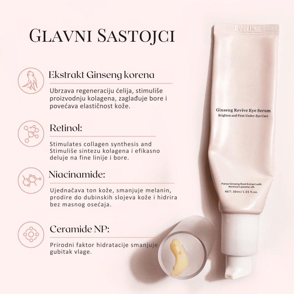 Serum sa ginsengom i retinalom koji smanjuje fine linije, tamne krugove i oticanje, revitalizuje kožu oko očiju i poboljšava tonus.