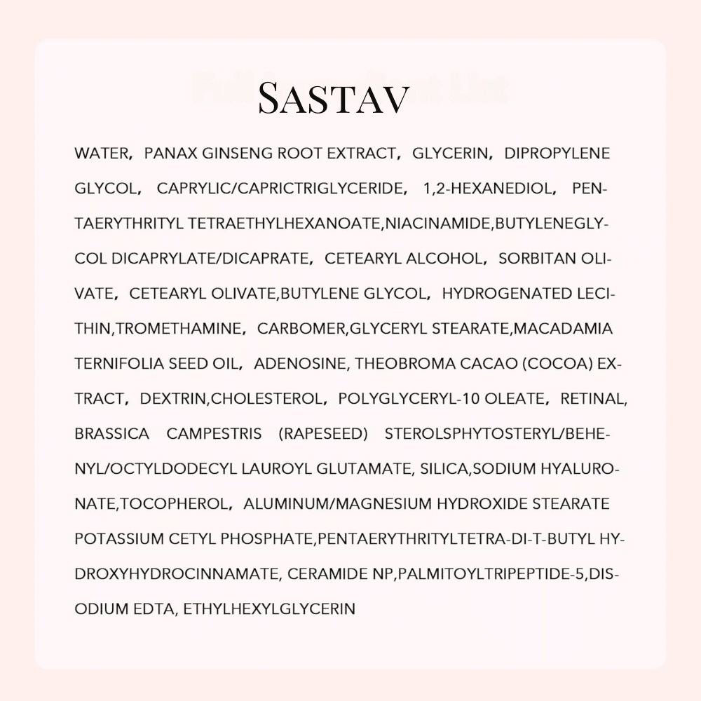 Water, Panax Ginseng Root Extract, Glycerin, Dipropylene Glycol, Caprylic/Capric Triglyceride, 1,2-Hexanediol, Pentaerythrityl Tetraethylhexanoate, Niacinamide, Butylene Glycol Dicaprylate/Dicaprate, Cetearyl Alcohol, Sorbitan Olivate, Cetearyl Olivate, Butylene Glycol, Hydrogenated Lecithin, Tromethamine, Carbomer, Glyceryl Stearate, Macadamia Ternifolia Seed Oil, Ethylhexylglycerin, Adenosine, Theobroma Cacao (Cocoa) Extract, Dextrin, Cholesterol, Polyglyceryl-10 Oleate, Disodum EDTA, Retinal, Brassica Campestris (Rapeseed) Sterols, Phytosteryl/Behenyl/Octyldodecyl Lauroyl Glutamate, Silica, Sodium Hyaluronate, Tocopherol, Aluminum/Magnesium Hydroxide Stearate, Potassium Cetyl Phosphate, Pentaerythrityl Tetra-Di-t-Butyl Hydroxyhydrocinnamate, Ceramide NP, Palmitoyl Tripeptide-5