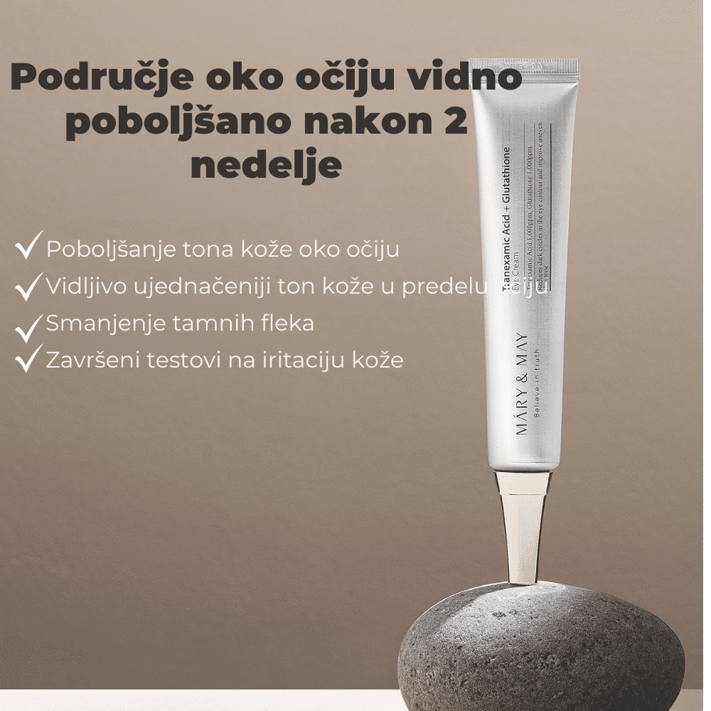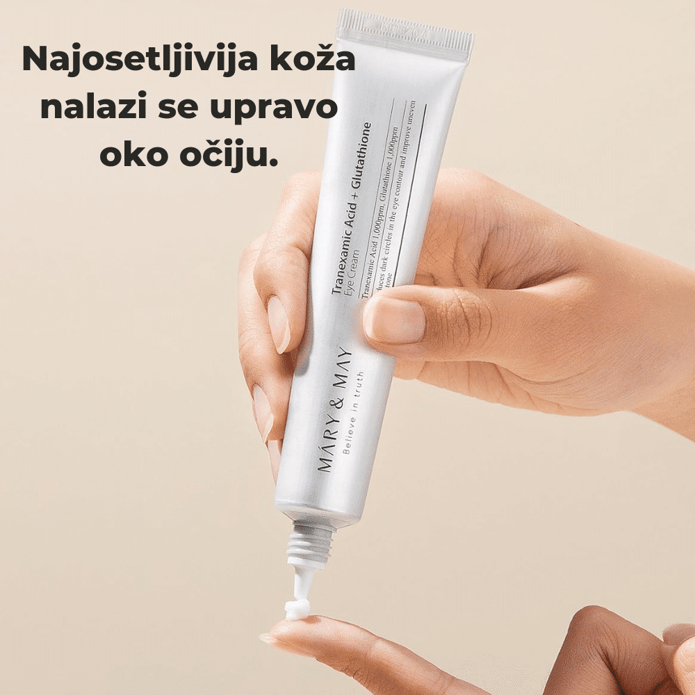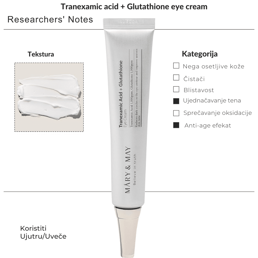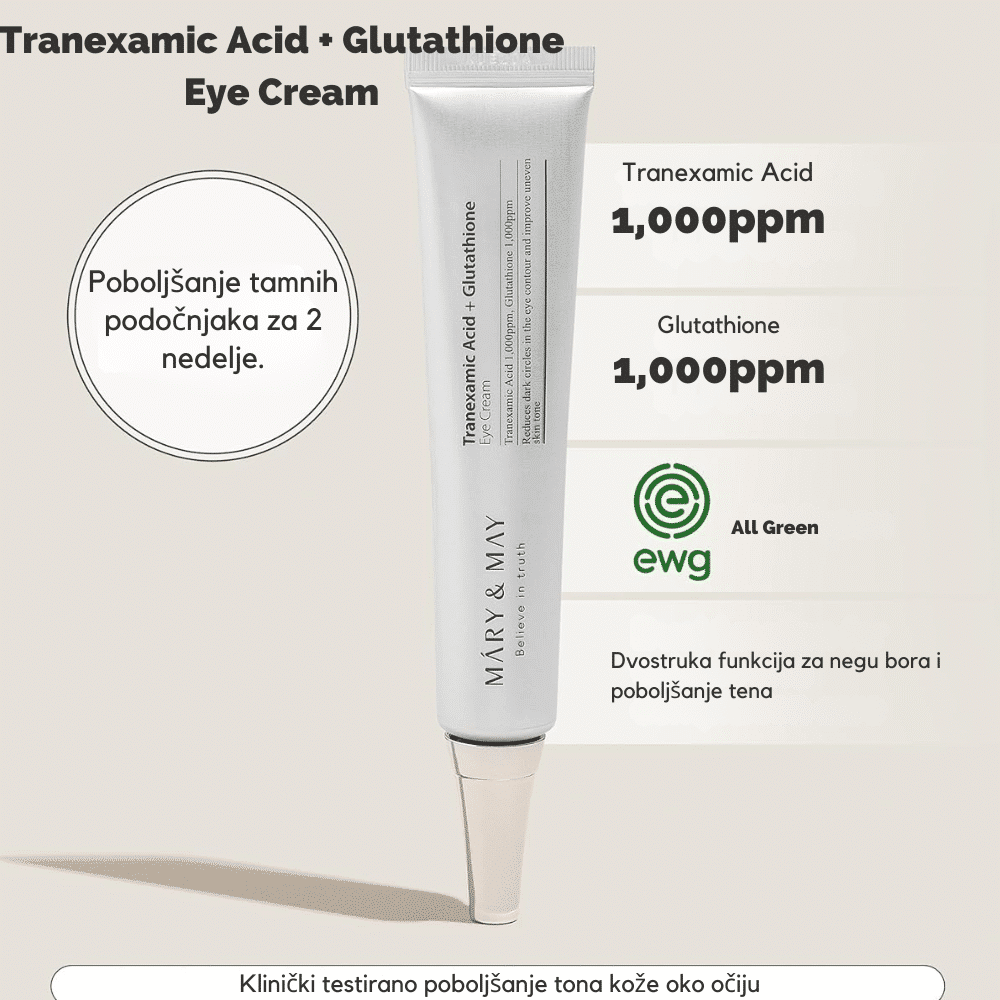 Krema za područje oko očiju sa traneksamskom kiselinom i glutathionom koja smanjuje tamne krugove, poboljšava tonus i hidrataciju, ostavljajući kožu glatkom i osveženom.