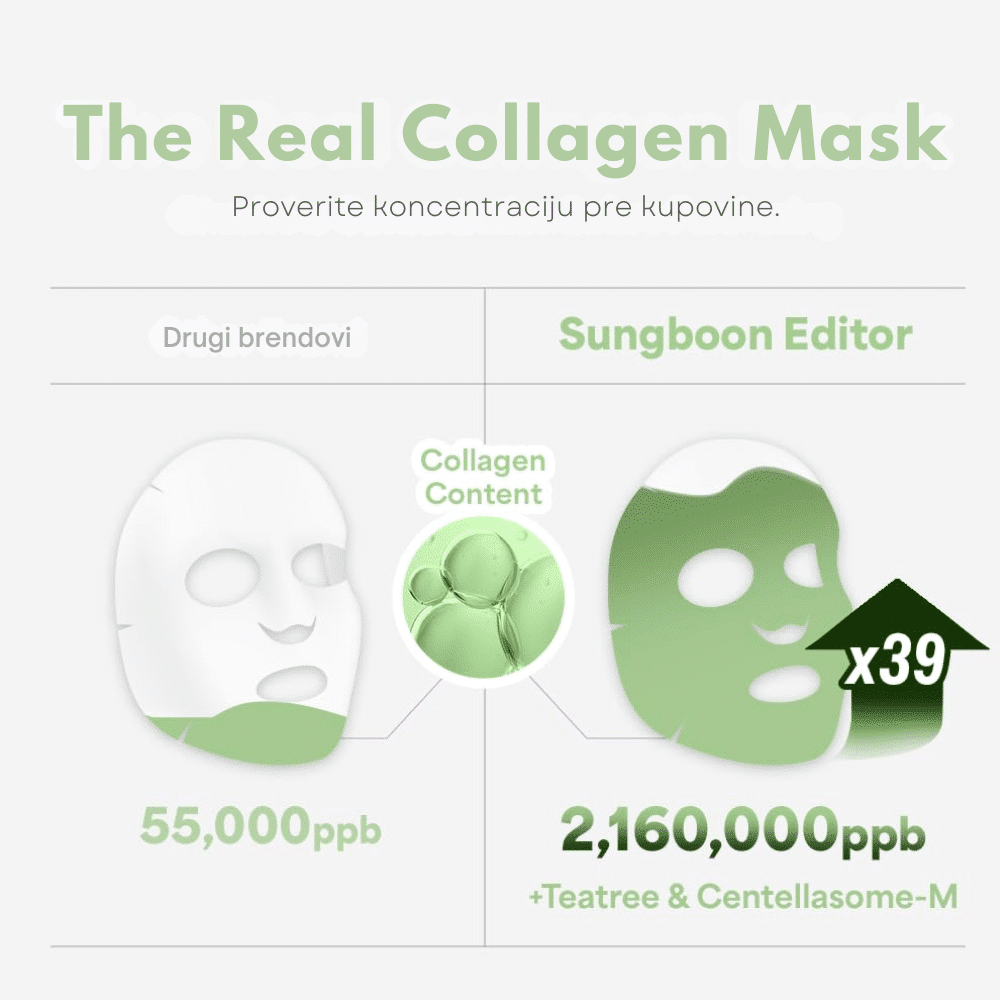 SUNGBOON EDITOR Deep Collagen Cica Teatree Soothing Mask je hidrogel maska dizajnirana za umirivanje iritirane kože, smanjenje crvenila i pružanje intenzivne hidratacije. Obogaćena je sa 2.160.000 ppb kolagena niske molekulske mase, koji pomaže u poboljšanju elastičnosti kože i smanjenju vidljivosti bora. Pored toga, sadrži 10.780 ppm ekstrakta Centella Asiatica (Cica) za umirenje kože i ekstrakt čajevca za dodatno smanjenje iritacija i kontrolu sebuma. Ova maska pruža efekat hlađenja, pomažući u smanjenju temperature kože i pružajući osvežavajući osećaj. Hidrogel struktura omogućava optimalno prianjanje na kožu, osiguravajući efikasnu apsorpciju aktivnih sastojaka.