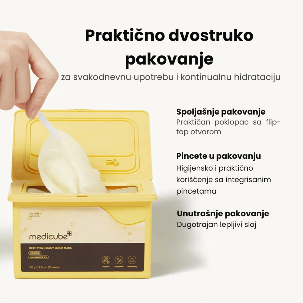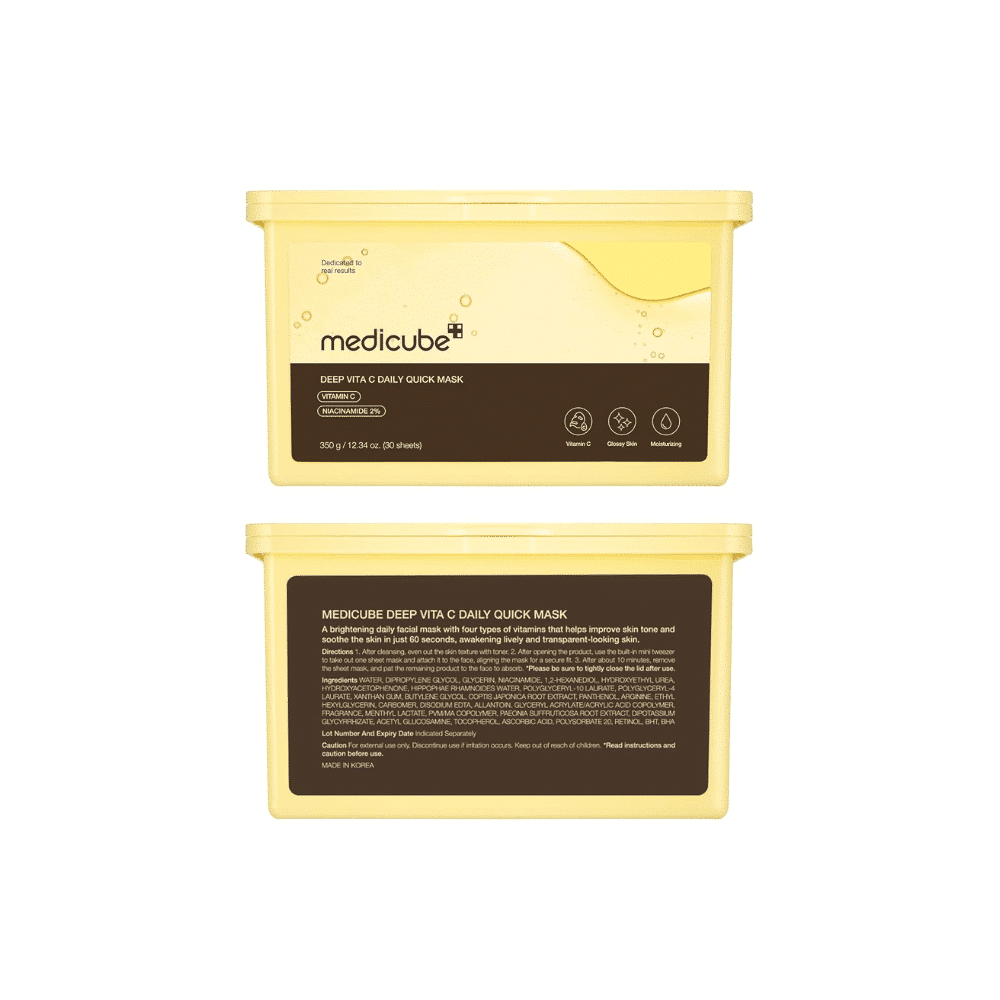 Medicube Deep Vita C Daily Quick Mask je set od 30 brzih maski za lice, formulisanih da pruže intenzivnu hidrataciju i posvetle ten. Obogaćene su Askorbinskom kiselinom (Vitamin C), poznatom po svojoj sposobnosti da smanji hiperpigmentacije i poboljša sjaj kože. Niacinamid i Acetil glukozamin dodatno ujednačavaju ton kože i pružaju antioksidativnu zaštitu. Panthenol (Vitamin B5) i Tokoferol (Vitamin E) obezbeđuju hidrataciju i štite kožu od spoljašnjih uticaja. Maske su izrađene od 100% biorazgradivog celuloznog materijala, koji savršeno prianja uz lice, omogućavajući maksimalnu apsorpciju aktivnih sastojaka.