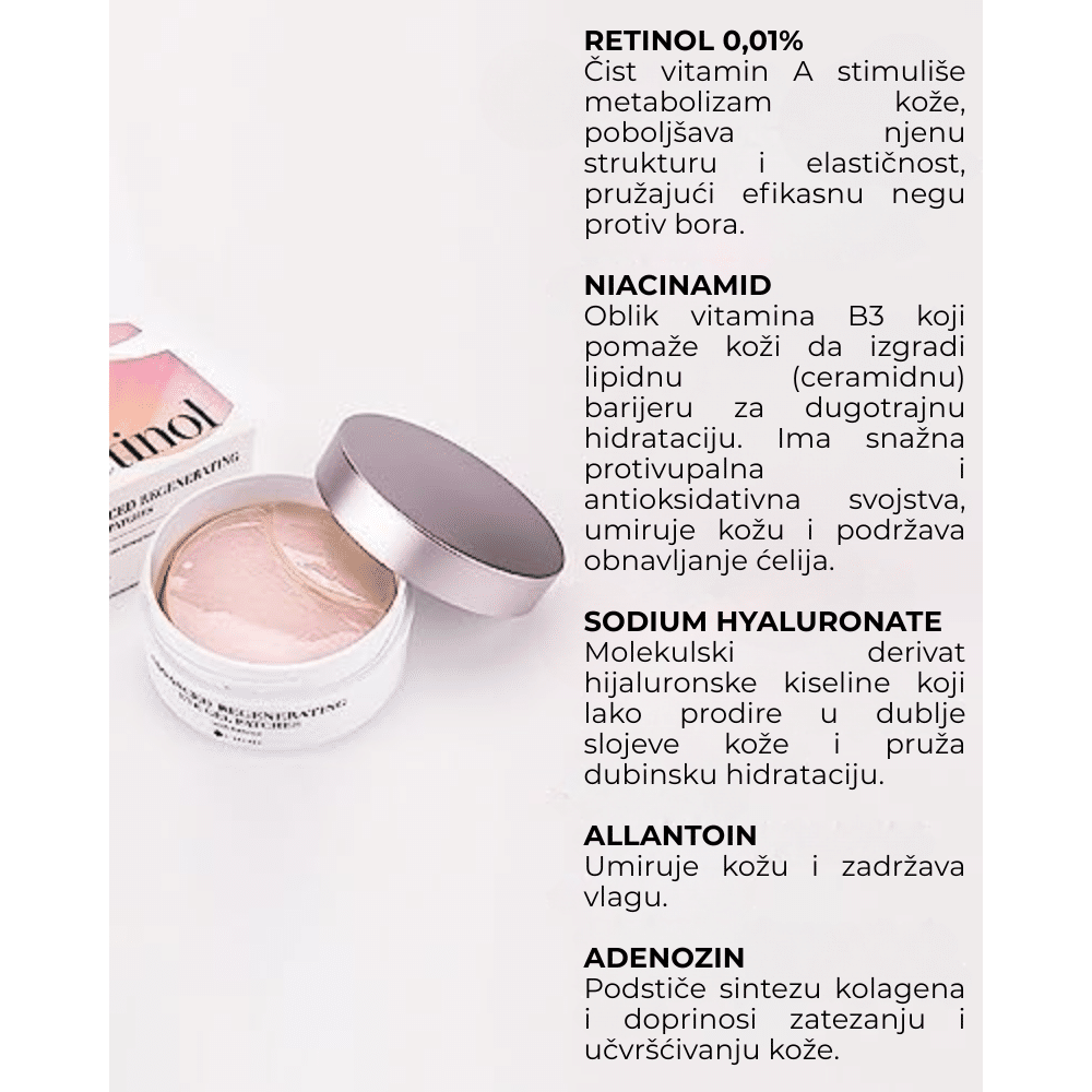 Hidrogelski flasteri za oči sa retinolom, niacinamidom i natrijum hijaluronatom koji smanjuju bore, pružaju intenzivnu hidrataciju i poboljšavaju elastičnost kože.