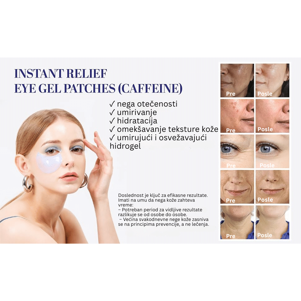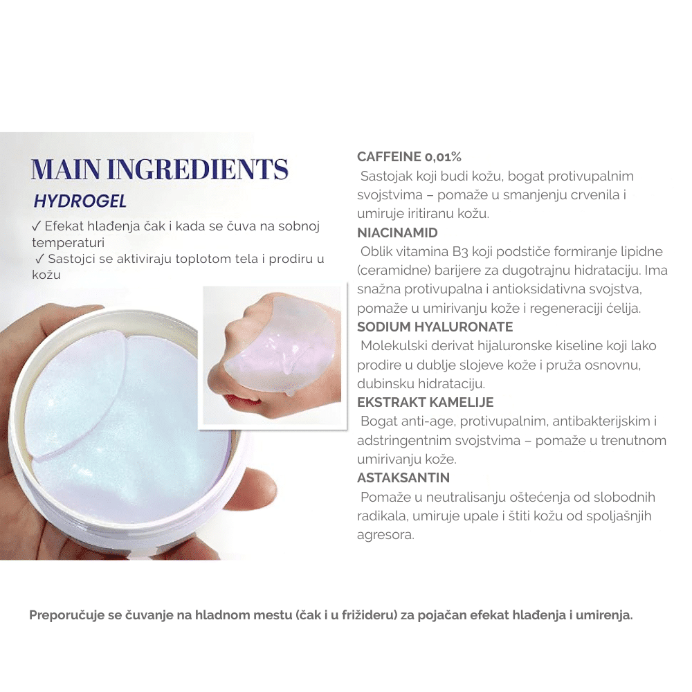 Hidrogelski flasteri za oči sa kofeinom, niacinamidom i natrijum hijaluronatom koji smanjuju natečenost, tamne kolutove i pružaju intenzivnu hidrataciju za osvežen izgled kože.