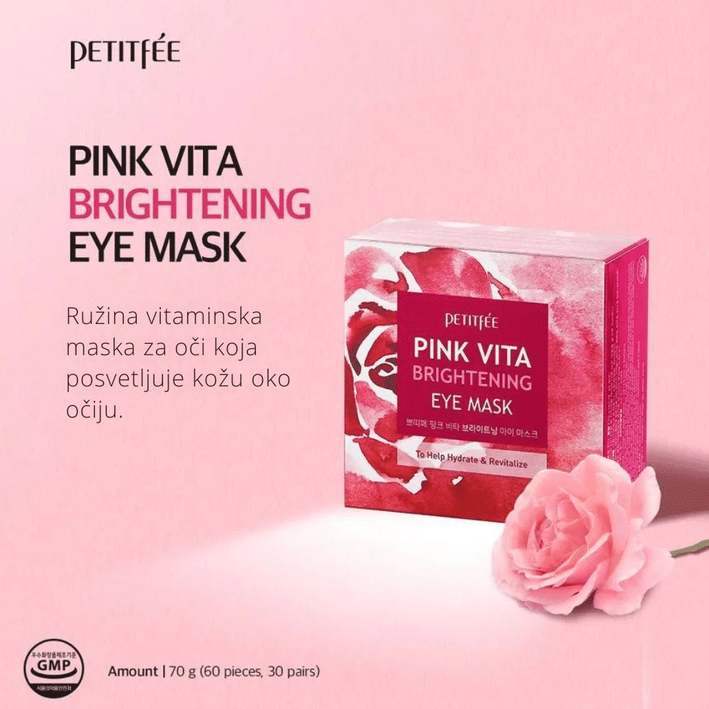 Petitfee Pink Vita Brightening Eye Mask su hidrogelni jastučići koje pomažu u posvetljivanju i hidrataciji kože oko očiju. Ove maskice sadrže bogatu esenciju obogaćenu vitaminima i ekstraktima biljaka koje pomažu u revitalizaciji kože, smanjenju podočnjaka i borbi protiv znakova starenja.