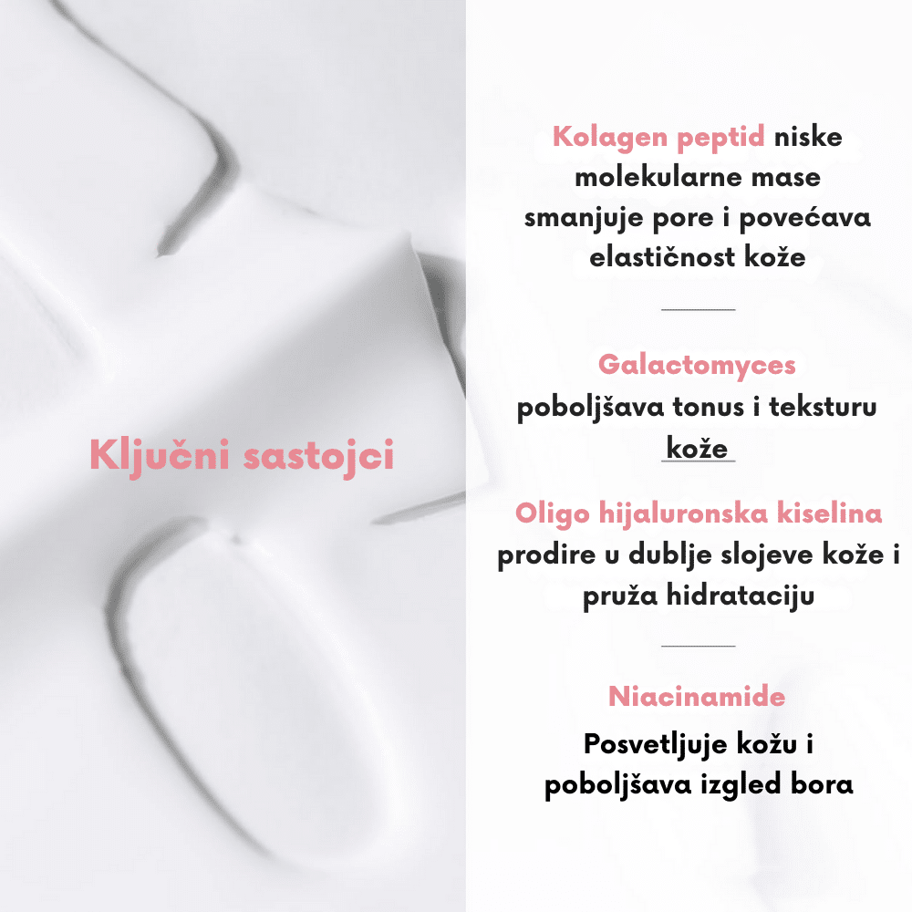 Ono što ovu masku izdvaja je jedinstvena hidrogelna struktura koja se savršeno prilagođava konturama lica, omogućavajući optimalnu apsorpciju aktivnih sastojaka. Bio-kolagen dublje prodire u kožu, stimulišući sintezu kolagena i poboljšavajući njenu elastičnost, dok galaktomices ferment filtrat balansira ten i smanjuje pore. Originalno razvijena za medicinske svrhe, hidrogel pruža hlađenje i izuzetnu prilagodljivost koži, omogućavajući efikasnu isporuku aktivnih sastojaka. Maska je dizajnirana da polako oslobađa visokokoncentrovane sastojke, pružajući dugotrajnu hidrataciju i ishranu koži. Klinički je testirana za nošenje do 8 sati, što je čini pogodnom za upotrebu tokom spavanja.