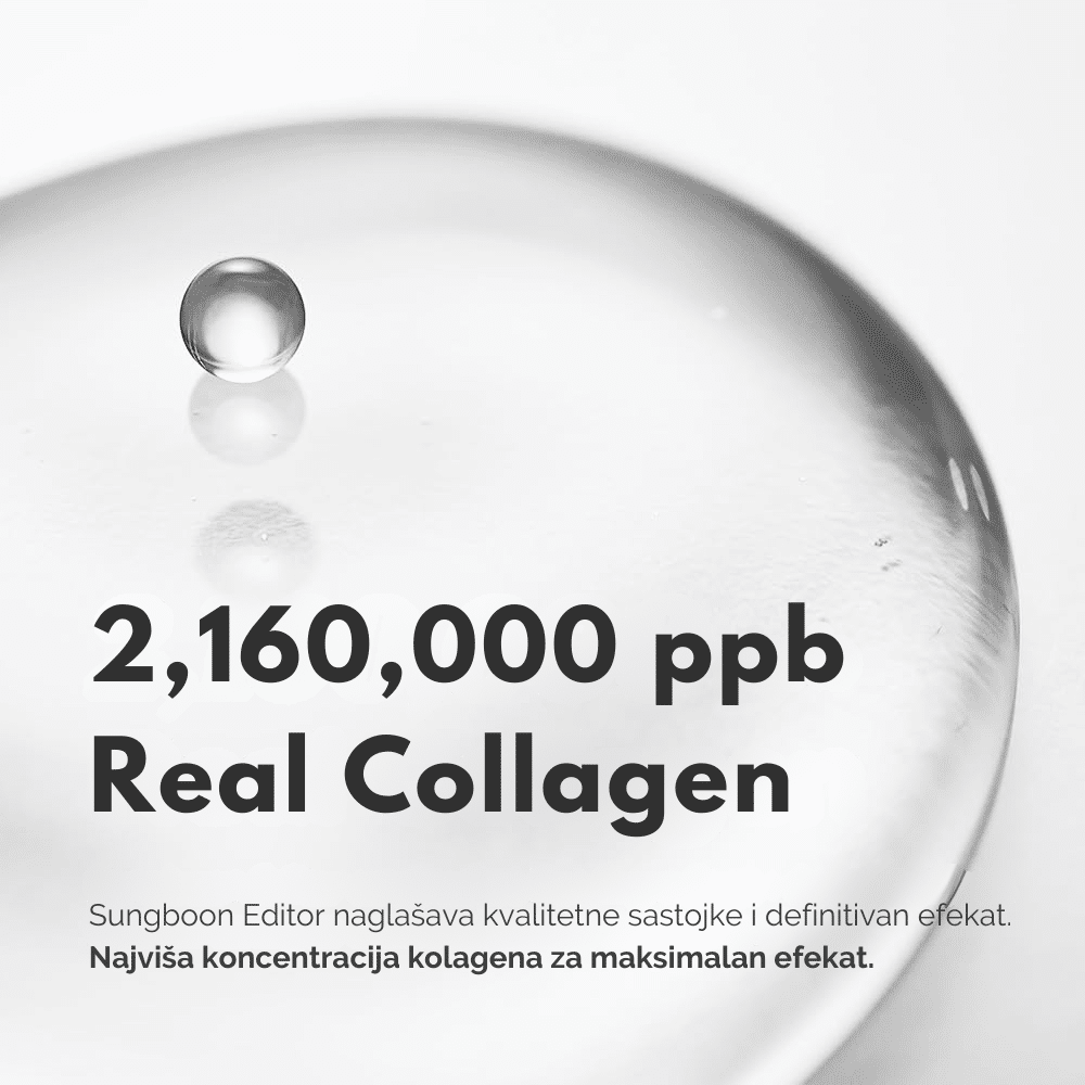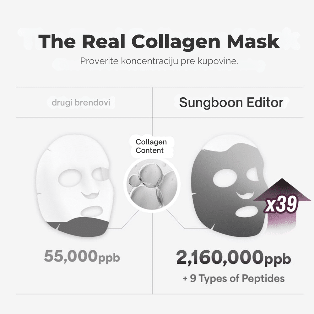 SUNGBOON EDITOR Deep Collagen Power Boosting Mask je visokokvalitetna hidrogel maska namenjena intenzivnoj hidrataciji, učvršćivanju i anti-age nezi kože. Obogaćena sa 2.160.000 ppb kolagena niske molekulske mase (500 Da), maska omogućava duboku apsorpciju, poboljšavajući elastičnost i vlažnost kože, čineći je blistavom i podmlađenom. ored kolagena, maska sadrži i SYN-COLL Peptid, koji se bori protiv finih linija i smanjuje pore, kao i Glyceryl Glucoside, koji doprinosi zdravlju kožne barijere i glatkoj teksturi.