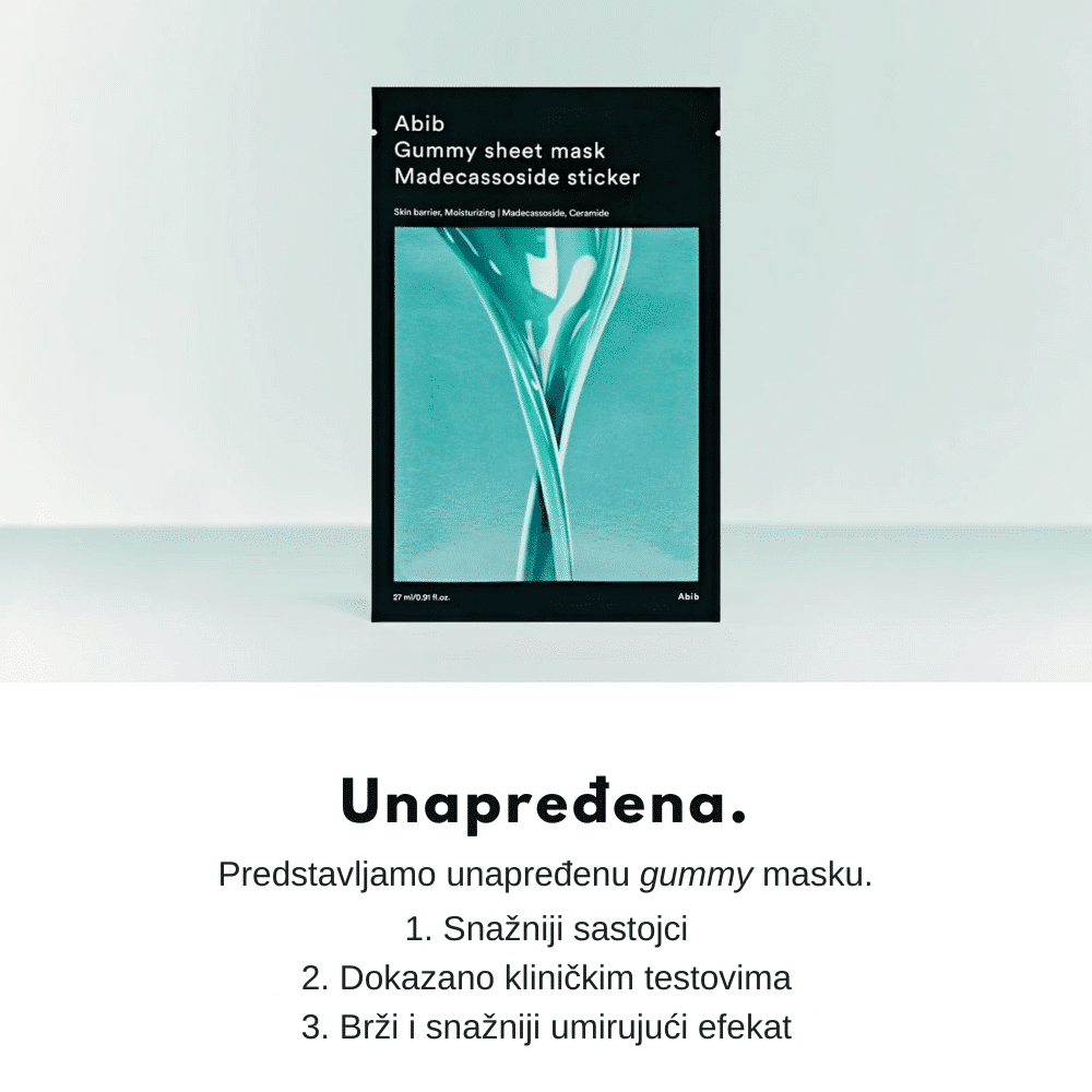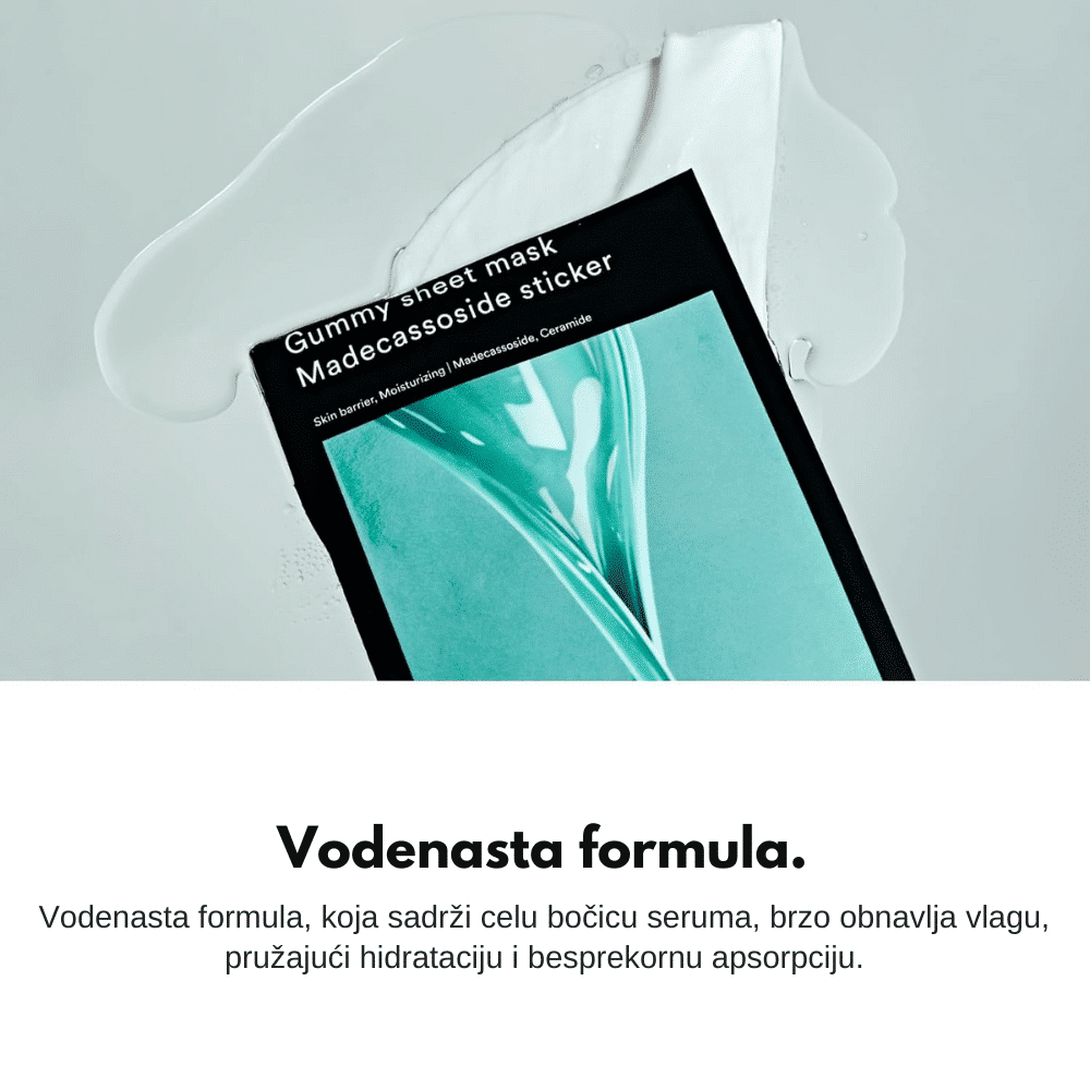 Gummy Sheet maska sa Madecassoside-om za regeneraciju, umirivanje i obnavljanje kože. Poboljšava teksturu i smanjuje crvenilo.