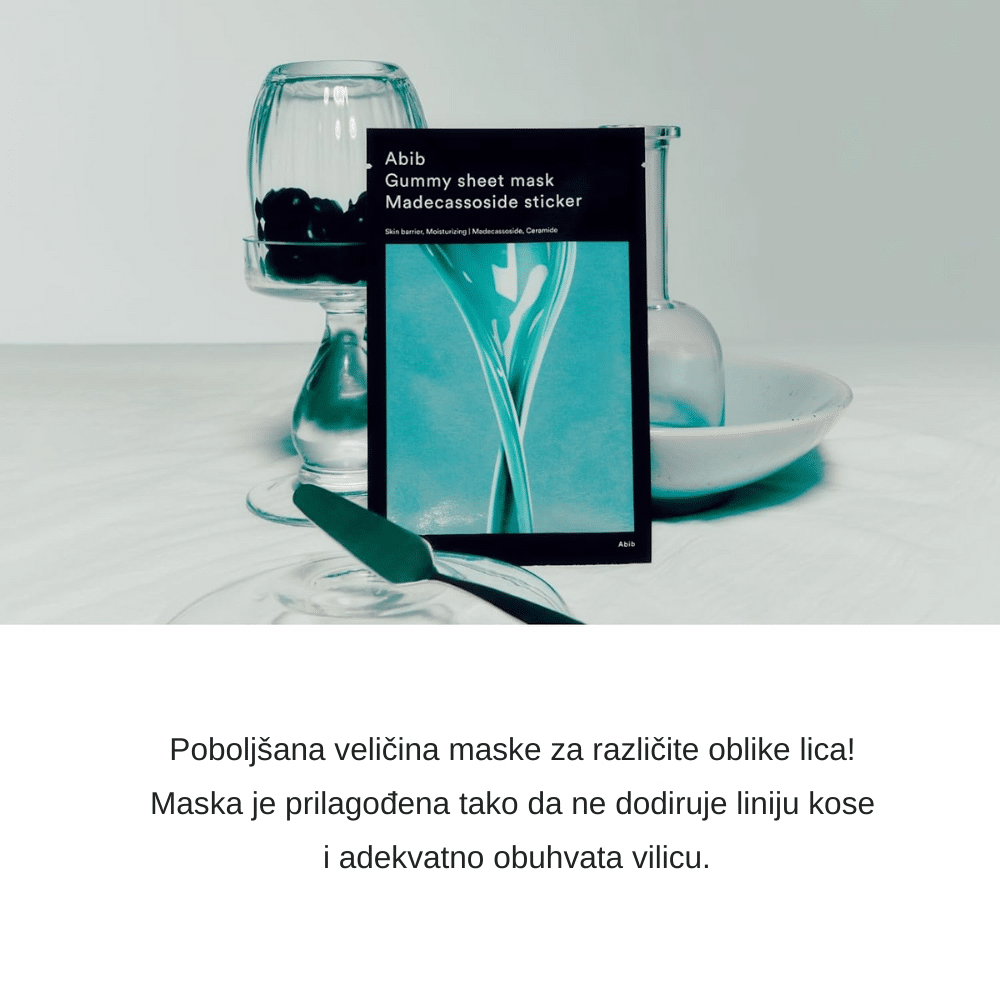 Abib Gummy Sheet Mask Madecassoside Sticker je sheet maska namenjena dubinskoj regeneraciji i umirivanju osetljive kože. Obogaćena Madecassoside-om, poznatim po svojim antiinflamatornim i regenerativnim svojstvima, ova maska pomaže u obnavljanju oštećene kožne barijere, smanjenju crvenila i iritacija. Njena „gummy“ tekstura omogućava maksimalno prianjanje na kožu, čime osigurava optimalnu apsorpciju esencije. Ova maska je idealna za sve tipove kože, a posebno za osetljivu i suvu kožu kojoj je potrebna dodatna nega.