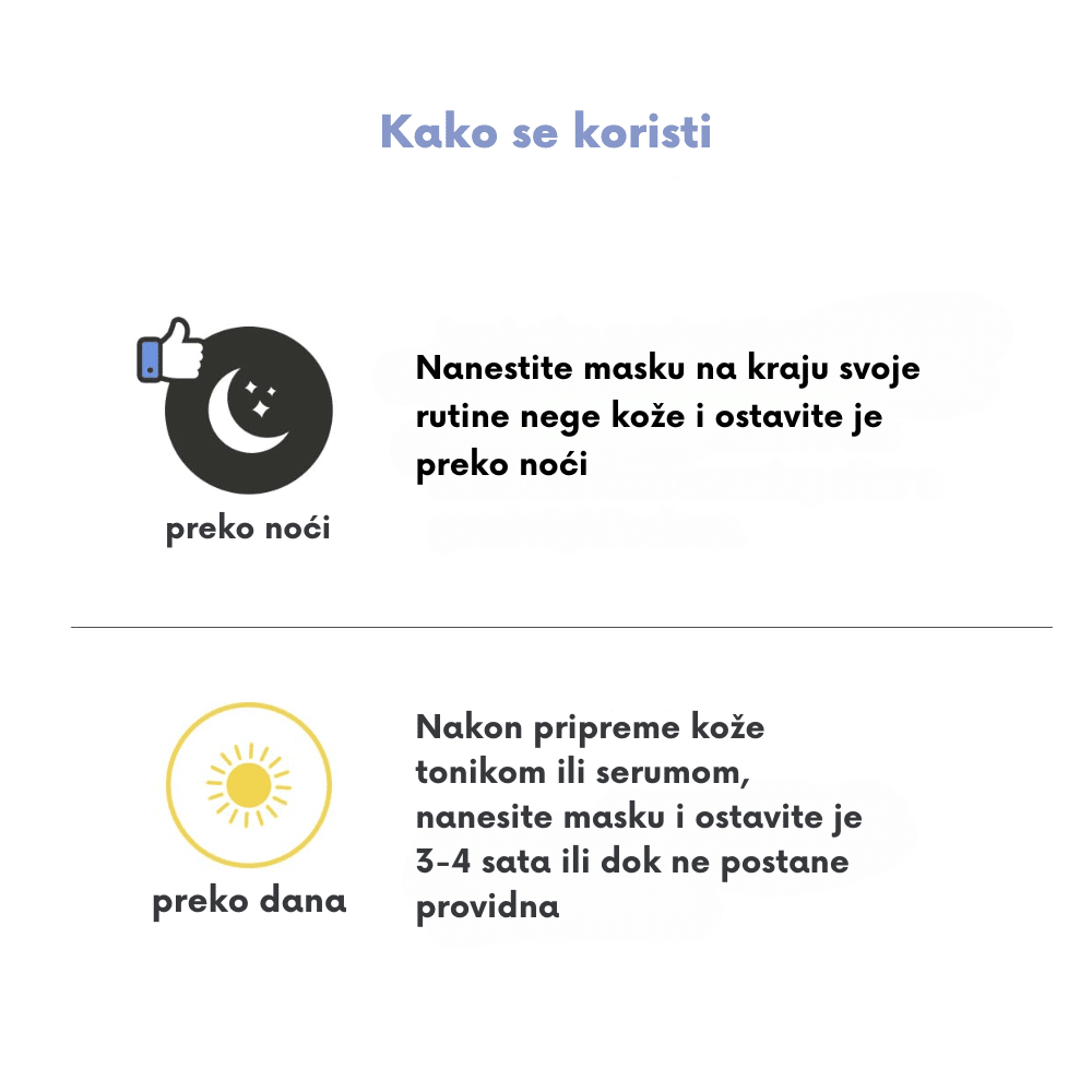Nakon čišćenja lica, nanesite tonik ili serum po želji. Pažljivo izvadite masku iz pakovanja i prilagodite je konturama lica. Za optimalne rezultate, ostavite masku da deluje 3-4 sata ili dok ne postane providna, omogućavajući potpunu apsorpciju aktivnih sastojaka. Maska je dovoljno nežna za noćnu upotrebu; nanesite je kao poslednji korak večernje rutine i ostavite preko noći. Ujutru je uklonite i nastavite sa uobičajenom negom. Izbegavajte kontakt sa očima. U slučaju iritacije, prekinite upotrebu i konsultujte se sa dermatologom.