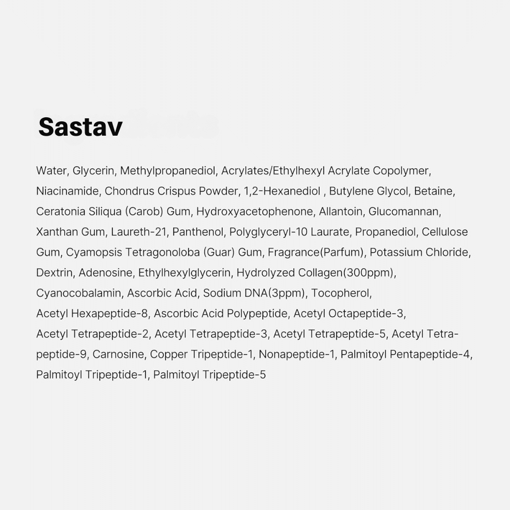 Water, Glycerin, Methylpropanediol, Acrylates/Ethylhexyl Acrylate Copolymer, Niacinamide, Chondrus Crispus Powder, 1,2-Hexanediol, Butylene Glycol, Betaine, Ceratonia Siliqua (Carob) Gum, Hydroxyacetophenone, Allantoin, Glucomannan, Xanthan Gum, Laureth-21, Panthenol, Polyglyceryl-10 Laurate, Propanediol, Cellulose Gum, Cyamopsis Tetragonoloba (Guar) Gum, Fragrance(Parfum), Potassium Chloride, Dextrin, Adenosine, Ethylhexylglycerin, Hydrolyzed Collagen, Cyanocobalamin, Ascorbic Acid, Sodium DNA, Tocopherol, Acetyl Hexapeptide-8, Ascorbic Acid Polypeptide, Acetyl Octapeptide-3, Acetyl Tetrapeptide-2, Acetyl Tetrapeptide-3, Acetyl Tetrapeptide-5, Acetyl Tetrapeptide-9, Carnosine, Copper Tripeptide-1, Nonapeptide-1, Palmitoyl Pentapeptide-4, Palmitoyl Tripeptide-1, Palmitoyl Tripeptide-5