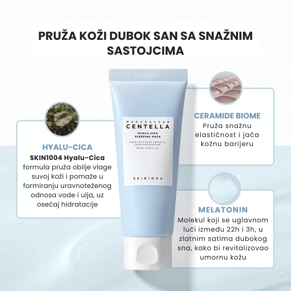 SKIN1004 Madagascar Centella Hyalu-Cica Sleeping Pack je lagana noćna maska sa gel teksturom koja pruža intenzivnu hidrataciju i umiruje kožu tokom noći. Formulacija kombinuje ekstrakt Centella Asiatica, poznat po svojim umirujućim svojstvima, sa tri vrste hijaluronske kiseline koje dubinski hidriraju i jačaju barijeru kože. Dodatni sastojci poput niacinamida i adenozina pomažu u posvetljivanju tena i smanjenju finih linija, dok melatonin doprinosi revitalizaciji kože. Ova maska je pogodna za sve tipove kože, uključujući osetljivu, i pomaže u balansiranju nivoa vlage i ulja u koži. ​