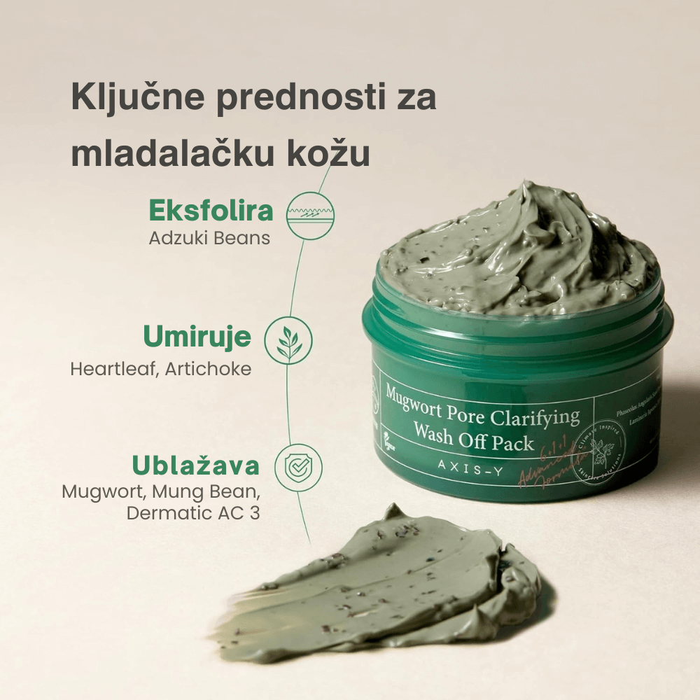 AXIS-Y Mugwort Pore Clarifying Wash Off Pack je maska za lice koja dubinski čisti pore, umiruje iritiranu kožu i pruža blagi piling. Formulisana sa 61% ekstrakta pelina (Artemisia Princeps), poznatog po svojim antiinflamatornim i umirujućim svojstvima, ova maska pomaže u smanjenju crvenila i iritacija. Kaolin i bentonit, prirodne gline bogate mineralima, efikasno upijaju višak sebuma i uklanjaju nečistoće iz pora, dok prah semena azuki pasulja (Phaseolus Angularis) pruža nežan fizički piling, uklanjajući mrtve ćelije kože i poboljšavajući teksturu kože. Dodatni biljni ekstrakti, poput Centella Asiatica i Houttuynia Cordata, doprinose regeneraciji i umirenju kože. Ova veganska i cruelty-free formula ne sadrži veštačke boje, mineralna ulja ni parabene, što je čini pogodnom za sve tipove kože, posebno za masnu i kožu sklonu aknama.