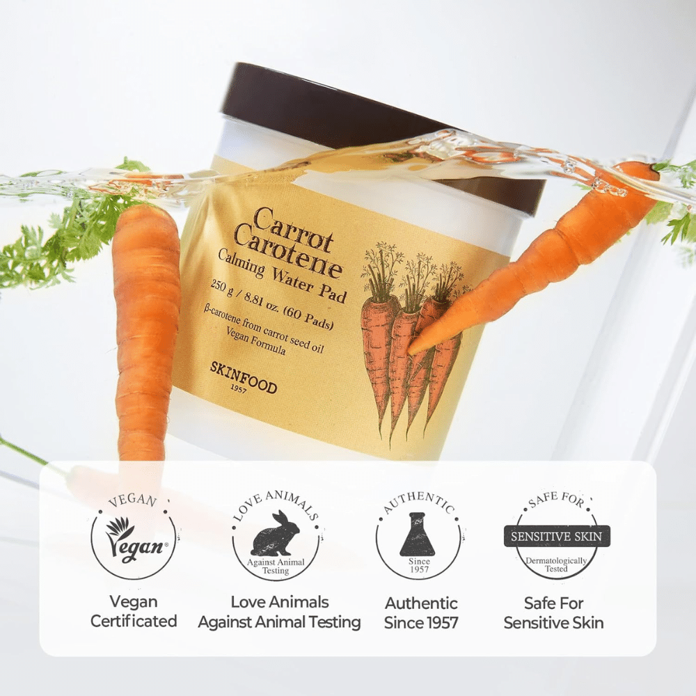 SKINFOOD Carrot Carotene Calming Water Pad je umirujući tretman u obliku pamučnih jastučića natopljenih hidratantnim i antioksidativnim rastvorom. Glavni sastojak, beta-karoten iz šargarepe, bogat je antioksidansima koji štite kožu od oštećenja slobodnih radikala, dok umiruje iritacije i crvenilo. Ovi jastučići sadrže i hijaluronsku kiselinu za hidrataciju kao i alantoin, koji dodatno umiruje i osvežava kožu.