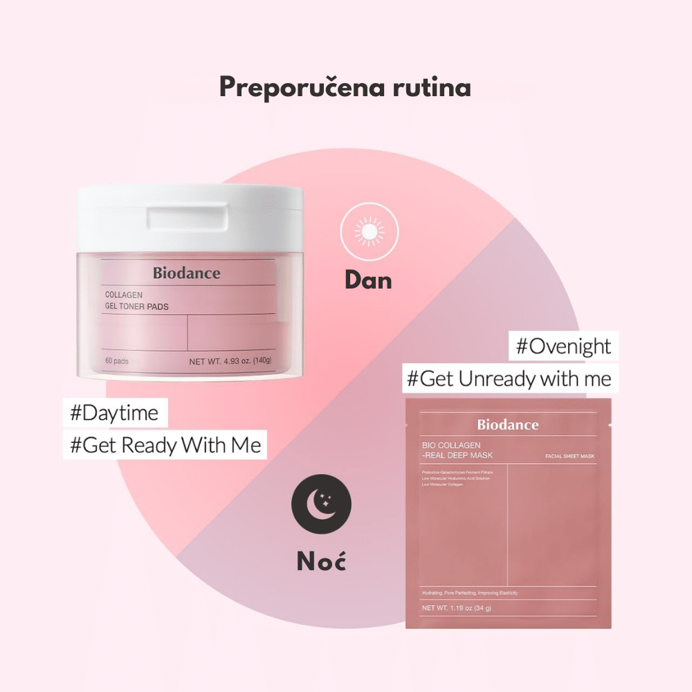 Za razliku od običnih kolagenskih proizvoda, Biodance Collagen Gel Toner Pads sadrže ultra-niskomolekularni kolagen, koji lako prodire u dublje slojeve kože, stimulišući regeneraciju i jačanje strukture kože. Ovaj tip kolagena pomaže u poboljšanju čvrstoće, elastičnosti i zadržavanju vlage, čineći kožu zategnutijom i hidriranom. Oligo hijaluronska kiselina dodatno povećava kapacitet kože za zadržavanje vlage, pružajući trenutni efekat hidratacije koji traje satima nakon primene. Galactomyces ferment filtrate, poznat po svojim probiotičkim svojstvima, deluje na ujednačavanje tona kože, poboljšanje teksture i posvetljivanje tena. Ovaj moćan sastojak pospešuje regeneraciju ćelija, smanjuje vidljivost sitnih bora i daje koži svež i blistav izgled. Ova kombinacija kolagena, hijaluronske kiseline i fermentisanih sastojaka osigurava cirkulaciju vlage i hranljivih sastojaka u koži, čime se sprečava isušivanje i gubitak elastičnosti.