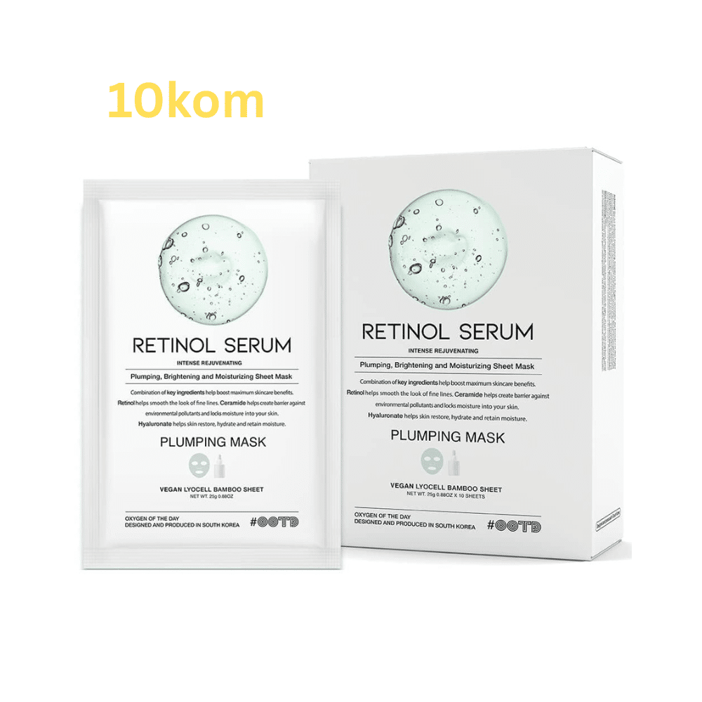 OOTD BEAUTY Retinol Serum Plumping Mask je visokokvalitetna sheet maska obogaćena retinolom, hijaluronskom kiselinom i vitaminom E, namenjena intenzivnoj nezi i podmlađivanju kože. Ova maska pruža dubinsku hidrataciju, poboljšava elastičnost kože i pomaže u smanjenju vidljivosti finih linija i bora. Retinol podstiče obnavljanje ćelija, dok hijaluronska kiselina zadržava vlagu, ostavljajući kožu glatkom i osveženom.