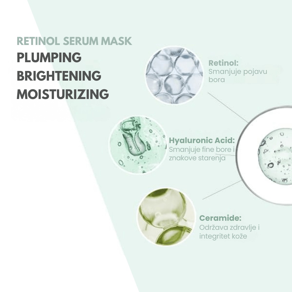 Sheet maska sa retinolom, hijaluronskom kiselinom i vitaminom E za dubinsku hidrataciju, poboljšanje elastičnosti i smanjenje finih linija.