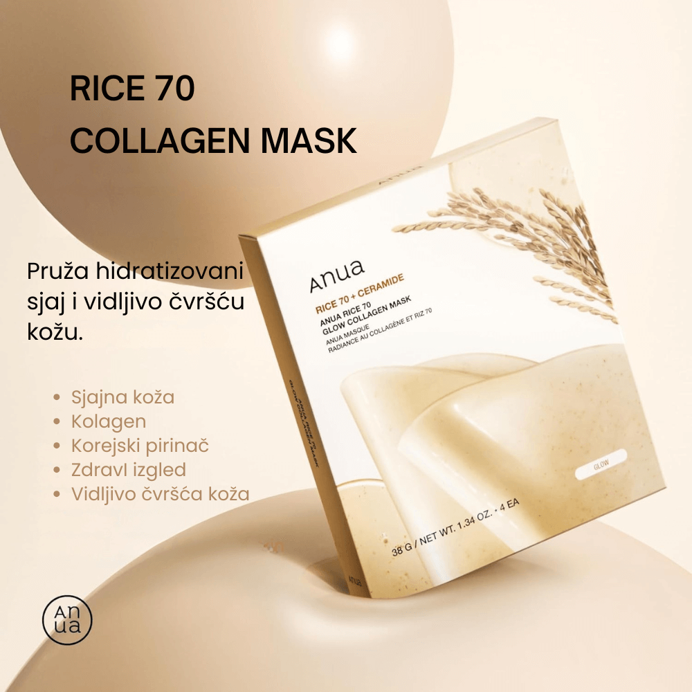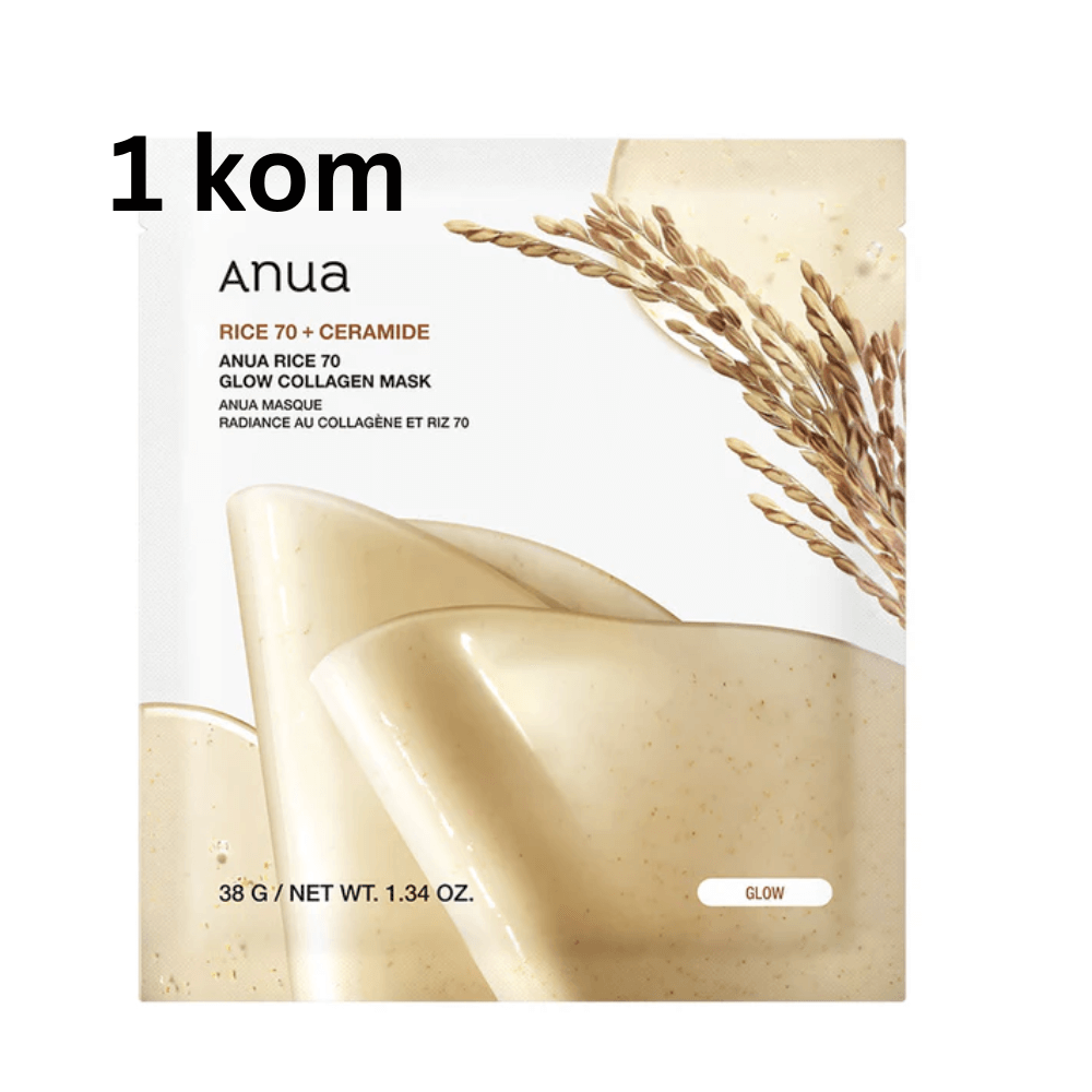 Anua Rice 70 Glow Collagen Mask je inovativna hidrogel maska dizajnirana da vašoj koži pruži dubinsku hidrataciju i blistavost. Sa 70% rižine vode i niskomolekularnim kolagenom (300 Da), ova maska efikasno poboljšava jasnoću i ravnotežu kože, čineći je glatkom i sjajnom. Ultra-tanak hidrogel sloj debljine 1 mm savršeno prijanja uz lice, omogućavajući produženo nošenje, čak i tokom noći, bez nelagodnosti. Pri kontaktu s kožom, maska se topi i postaje providna, oslobađajući aktivne sastojke koji prodiru duboko u kožu, pružajući joj potrebnu negu. Ceramidi u sastavu pomažu u održavanju zaštitne barijere kože, dok panthenol dodatno hidrira i umiruje. Rezultat je osvežena, hidrirana i blistava koža sa efektom „glass skin“.