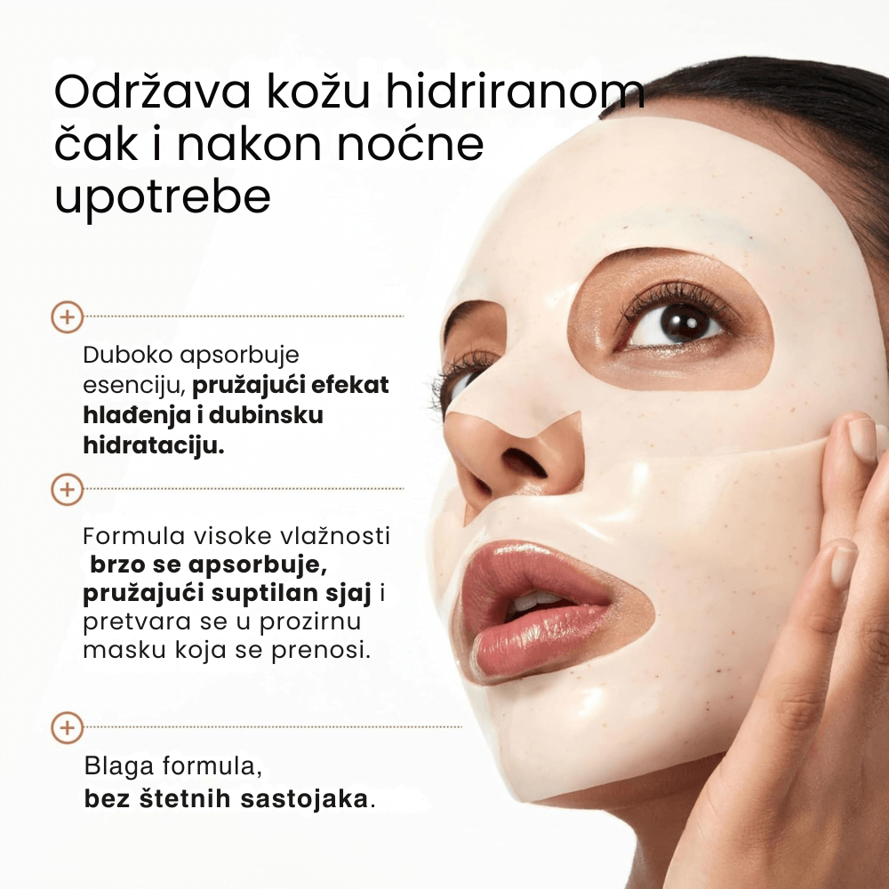 Hidrogel maski sa 70% rižine vode i niskomolekularnim kolagenom pruža dubinsku hidrataciju i poboljšava blistavost kože.