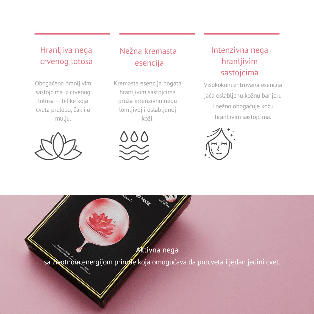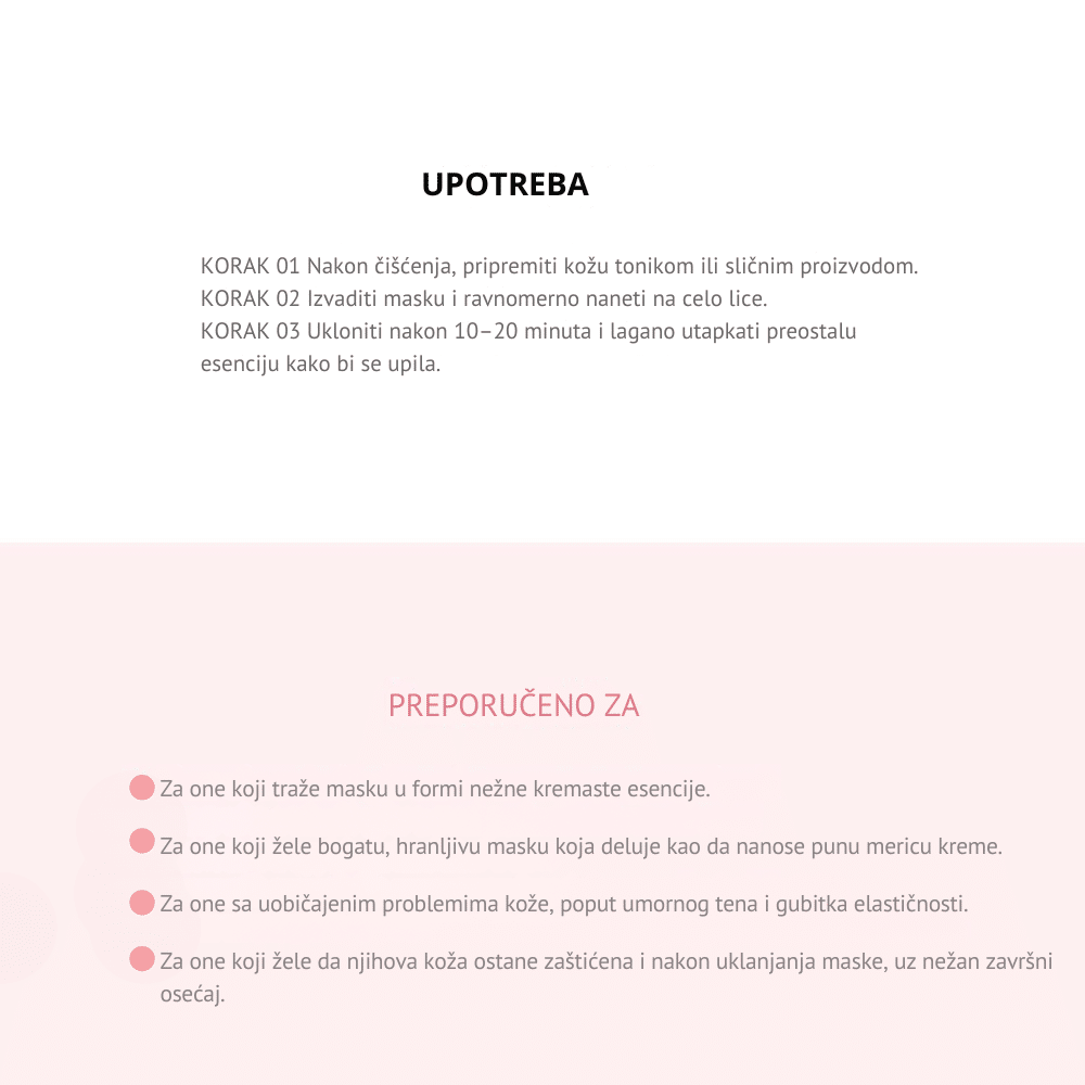 Intenzivno hranljiva sheet maska koja hidrira i revitalizuje kožu, poboljšava njenu elastičnost i vraća prirodni sjaj.