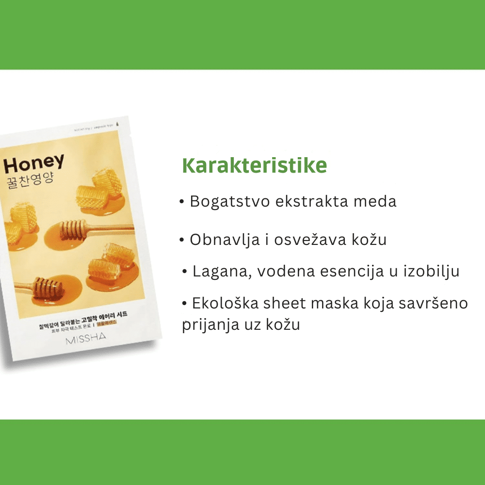 Missha Airy Fit Sheet Mask Honey je hranljiva sheet maska obogaćena ekstraktom meda, poznatim po svojim hidratantnim i umirujućim svojstvima. Ova maska dubinski hrani kožu, pomaže u jačanju njene barijere i pruža zdrav, blistav izgled. Zahvaljujući laganoj i prozračnoj tkanini, maska omogućava bolju apsorpciju esencije i optimalno prianjanje na kožu. Med u formuli pomaže u zadržavanju vlage, dok pantenol i alantoin dodatno umiruju i omekšavaju kožu. Nakon upotrebe, koža ostaje nahranjena, revitalizovana i glatka na dodir