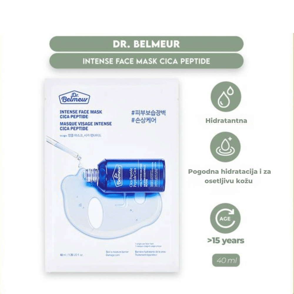 THE FACE SHOP Dr. Belmeur Intense Face Mask Cica Peptide je visokokoncentrovana maska koja pruža dubinsku hidrataciju i umiruje iritiranu kožu, čineći je mekanom, glatkom i revitalizovanom. Formulisana sa ekstraktom Centella Asiatica, poznatom po regenerativnim i umirujućim svojstvima, ova maska pomaže u jačanju kožne barijere i ublažavanju crvenila i iritacija.