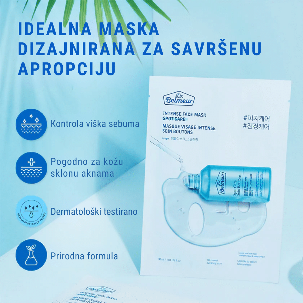 THE FACE SHOP Dr. Belmeur Intense Face Mask Spot Care je intenzivna maska namenjena tretiranju problematičnih područja kože sklonih aknama i nepravilnostima. Obogaćena umirujućim i hidratantnim sastojcima, ova maska pomaže u smirivanju iritacija, kontroli viška sebuma i smanjenju crvenila.