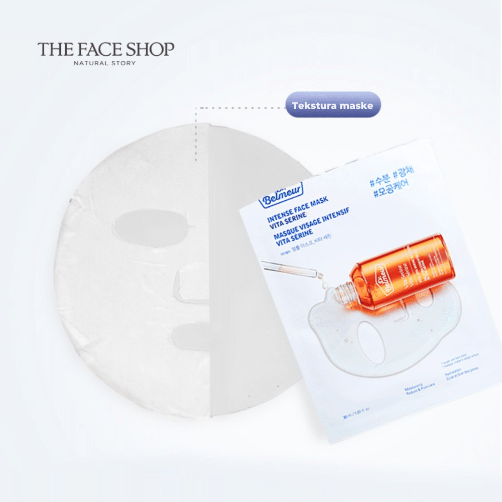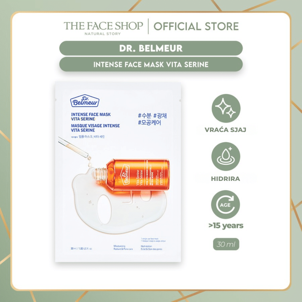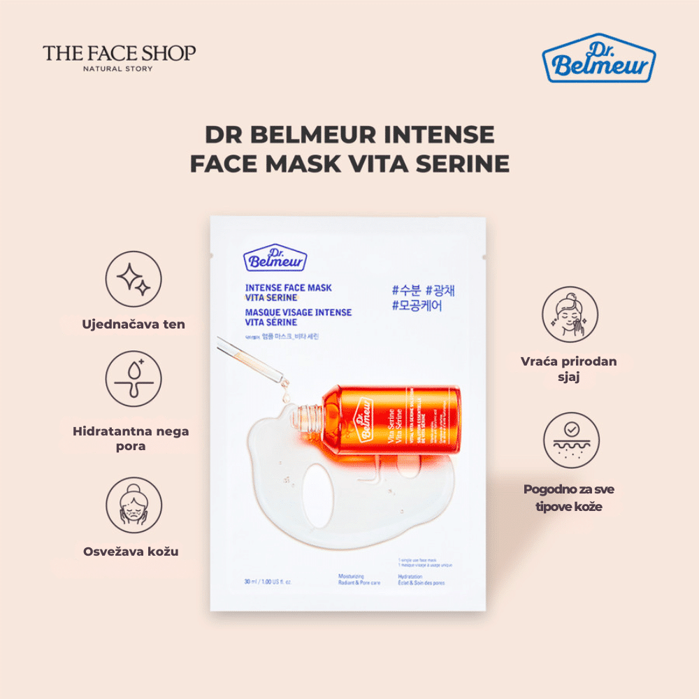 THE FACE SHOP Dr.Belmeur Intense Face Mask Vita Serine je visokokvalitetna serum-maska namenjena za posvetljivanje i ujednačavanje tena. Ova maska sadrži 5-slojnu rajon masku natopljenu celom bočicom Vita Serine ampule, pružajući intenzivnu negu i vraćajući sjaj umornoj i beživotnoj koži. Obogaćena je vitamin kompleksom koji uključuje derivat vitamina C, vitamin B3 (niacinamid) i provitamin B5 (pantenol), koji zajedno deluju na posvetljivanje kože i smanjenje hiperpigmentacija. Dodatno, serin i hijaluronska kiselina pružaju dubinsku hidrataciju, poboljšavaju elastičnost kože i jačaju njenu barijeru. Ova maska je dermatološki testirana i ne sadrži 8 štetnih aditiva, uključujući fenoksietanol, benzojevu kiselinu i benzofenon-3, što je čini pogodnom za suvu i osetljivu kožu.